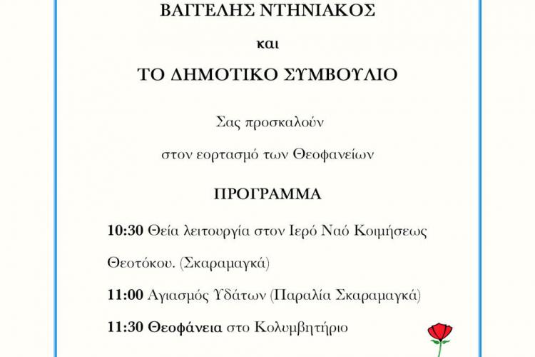 Οι εορτασμοί Θεοφανείων του Δήμου Χαιδαρίου θα διεξαχθούν τη Δευτέρα 6/1 στο Σκαραμαγκά.