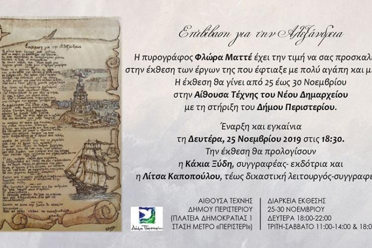 Έκθεση έργων της πυρογράφου Φλώρας Ματτέ στο Περιστέρι 0 Σχόλιοs Η έκθεση έργων της πυρογράφου Φλώρας Ίττε ΕΠΙΒΙΒΑΣΗ ΓΙΑ ΤΗΝ ΑΛΕΞΑΝΔΡΕΙΑ θα διεξαχθεί από 25 ως