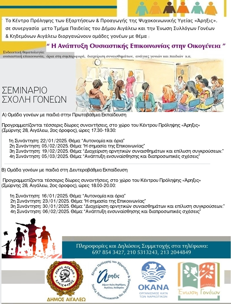 Ο Δήμος Αιγάλεω το Κέντρο Πρόληψης «Άρηξις» και η Ένωση Γονέων και Κηδεμόνων Αιγάλεω καλούν τους γονείς να συμμετάσχουν, ενδυναμώνοντας τις οικογενειακές σχέσεις για ένα καλύτερο μέλλον!