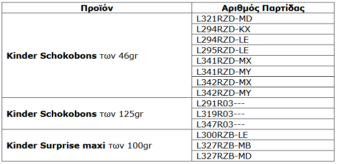 Ο ΕΦΕΤ ενημερώθηκε από το Σύστημα Έγκαιρης Προειδοποίησης για τα Τρόφιμα και τις Ζωοτροφές (RASFF), σχετικά με την προληπτική ανάκληση συγκεκριμένων παρτίδων των προϊόντων Kinder Schokobons των 46 gr & 125 gr και Kinder Surprise maxi των 100 gr, λόγω πιθανής παρουσίας σαλμονέλας.