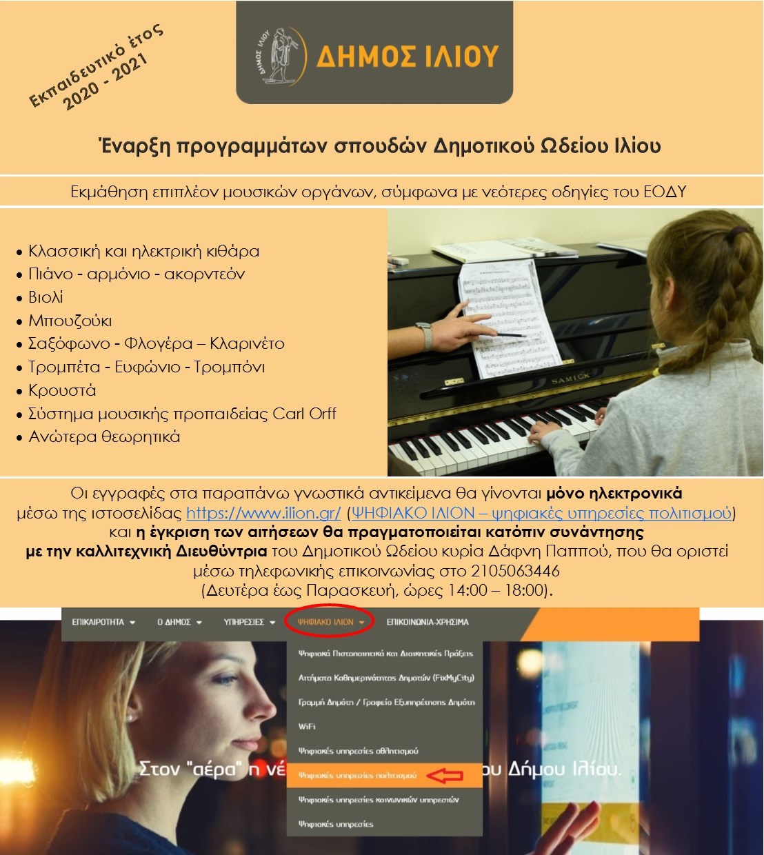 Ο Δήμος Ιλίου ενημερώνει για την έναρξη των προγραμμάτων σπουδών του Δημοτικού Ωδείου, τα οποία περιλαμβάνουν την εκμάθηση επιπλέον μουσικών οργάνων, σύμφωνα με νεότερες οδηγίες του ΕΟΔΥ.