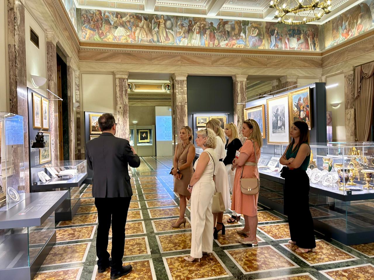Οι καλεσμένες της Γραμματέως μαζί με την ίδια επισκέφθηκαν και το κυρίως τμήμα της Έκθεσης που αναπτύσσεται στο πρώτο όροφο του Μεγάρου της Βουλής , στην μεγαλοπρεπή Αίθουσα Ελευθέριος Βενιζέλος γνωστή ιστορικά με την ονομασία Αίθουσα «Τροπαίων και Υπασπιστών»