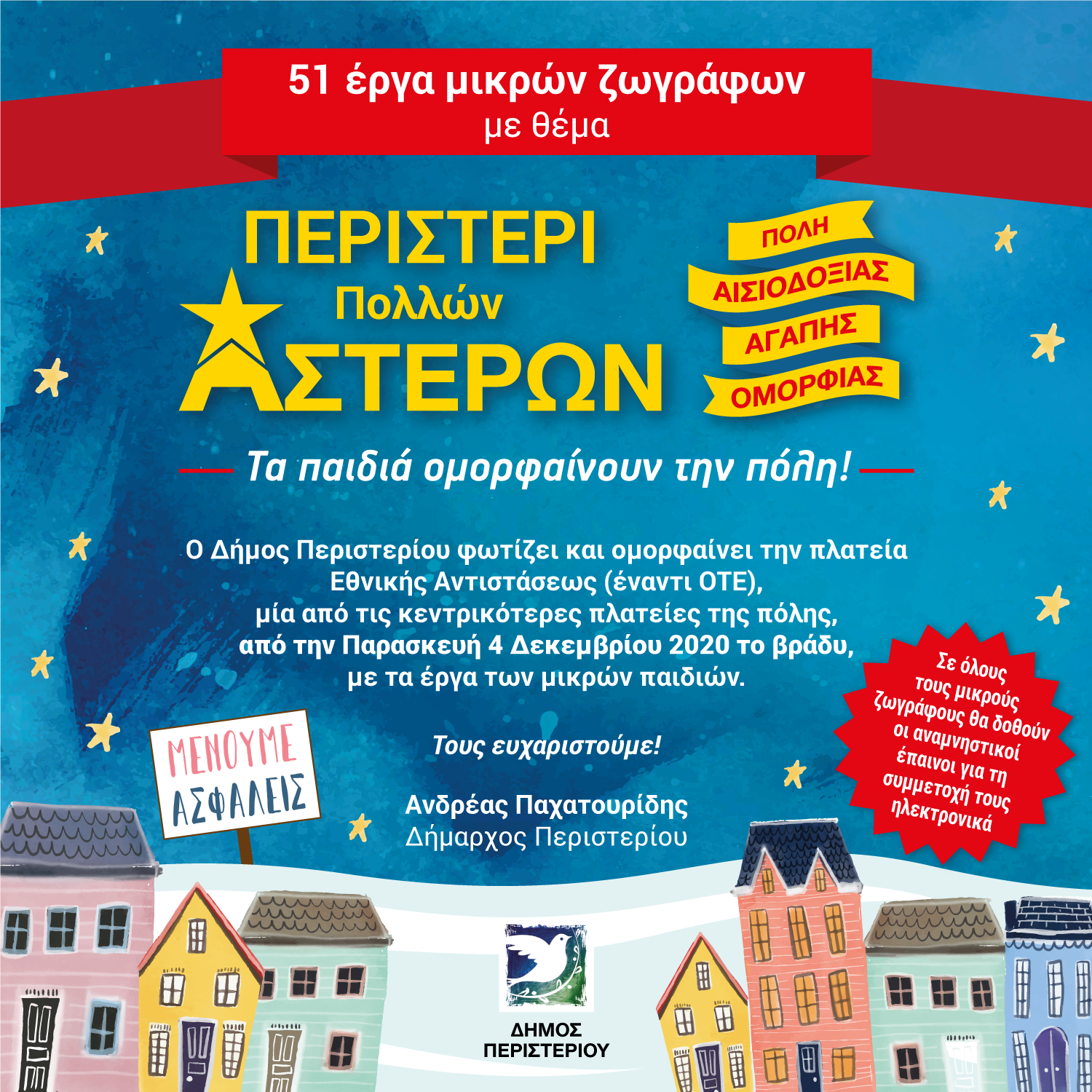Ο Δήμος Περιστερίου φωτίζει και ομορφαίνει την πλατεία Εθνικής Αντιστάσεως (έναντι ΟΤΕ), μία από τις κεντρικότερες πλατείες της πόλης, από την Παρασκευή 4 Δεκεμβρίου 2020 το βράδυ, με τα έργα των μικρών παιδιών.