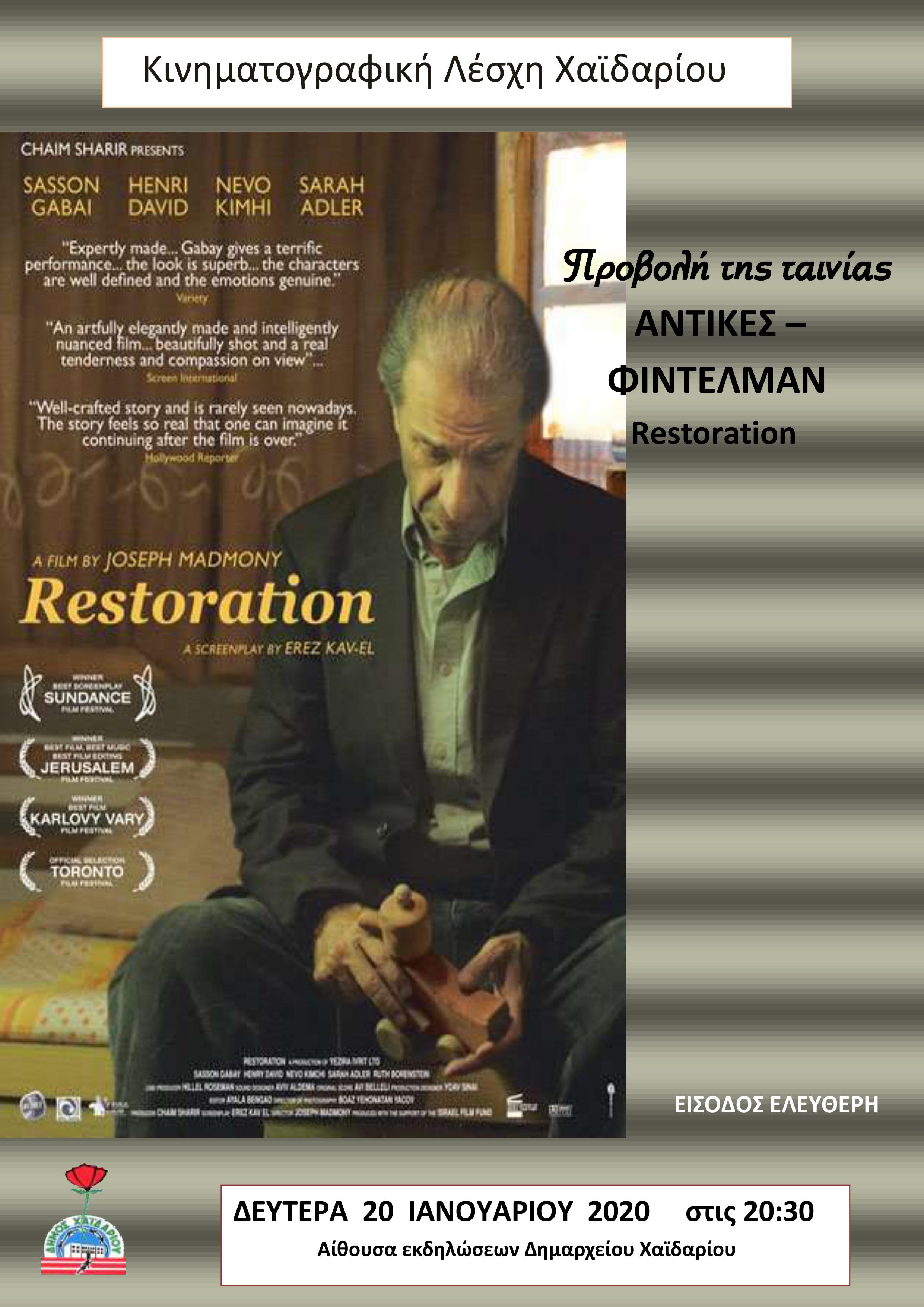 Τη Δευτέρα 20 Ιανουαρίου 2020 θα λάβει χώρα στην αίθουσα Πολλαπλών Χρήσεων Δημαρχείου Χαϊδαρίου στις 20:30 η προβολή της ισραηλινής ταινίας «Restoration». Η προβολή γίνεται σε συνεργασία του Δήμου με την κινηματογραφική λέσχη Χαϊδαρίου.Η ταινία έχει αποσπάσει διακρίσεις σε σημαντικά φεστιβάλ, όπως Βραβείο Καλύτερης Ταινίας Διεθνές Φεστιβάλ Κινηματογράφου Ιερουσαλήμ 2011 και βραβείο Καλύτερης Ταινίας Διεθνές Φεστιβάλ Κινηματογράφου Κάρλοβι Βάρι 2011.Είσοδος ελεύθερη.
