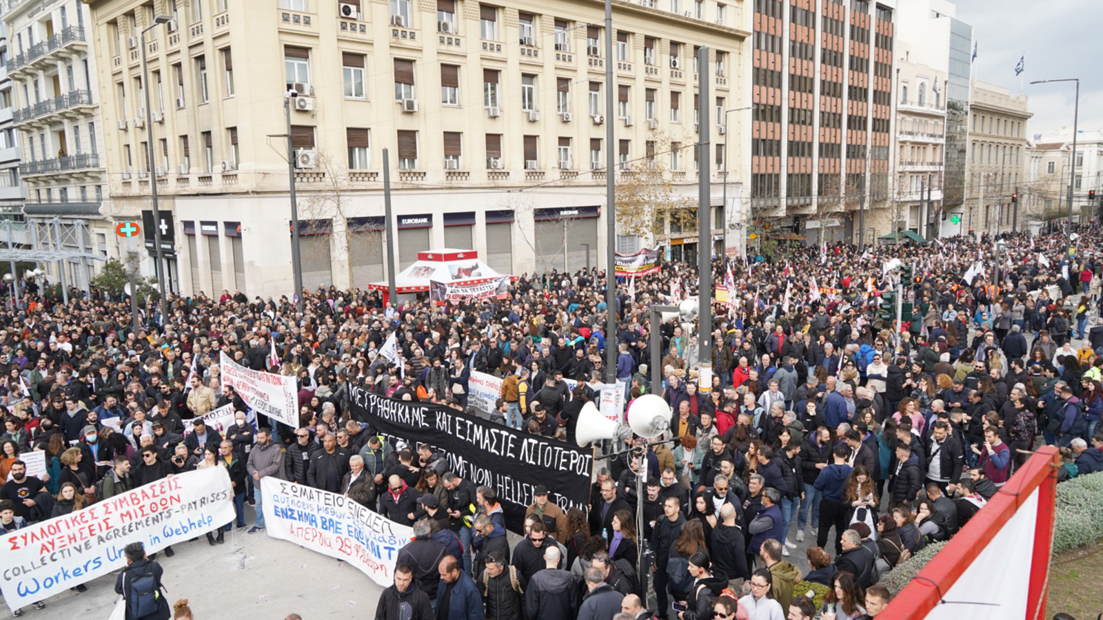 Οι διαδηλωτές απλώθηκαν από την Ομόνοια μέχρι και το Σύνταγμα σε ένα ανθρώπινο ποτάμι που ζητούσε δικαίωση για τους νεκρούς του δυστυχήματος των Τεμπών. Παράλληλα διαδήλωσαν για αυξήσεις στους μισθούς, για μέτρα κατά της ακρίβειας και πολλά άλλα αιτήματα.