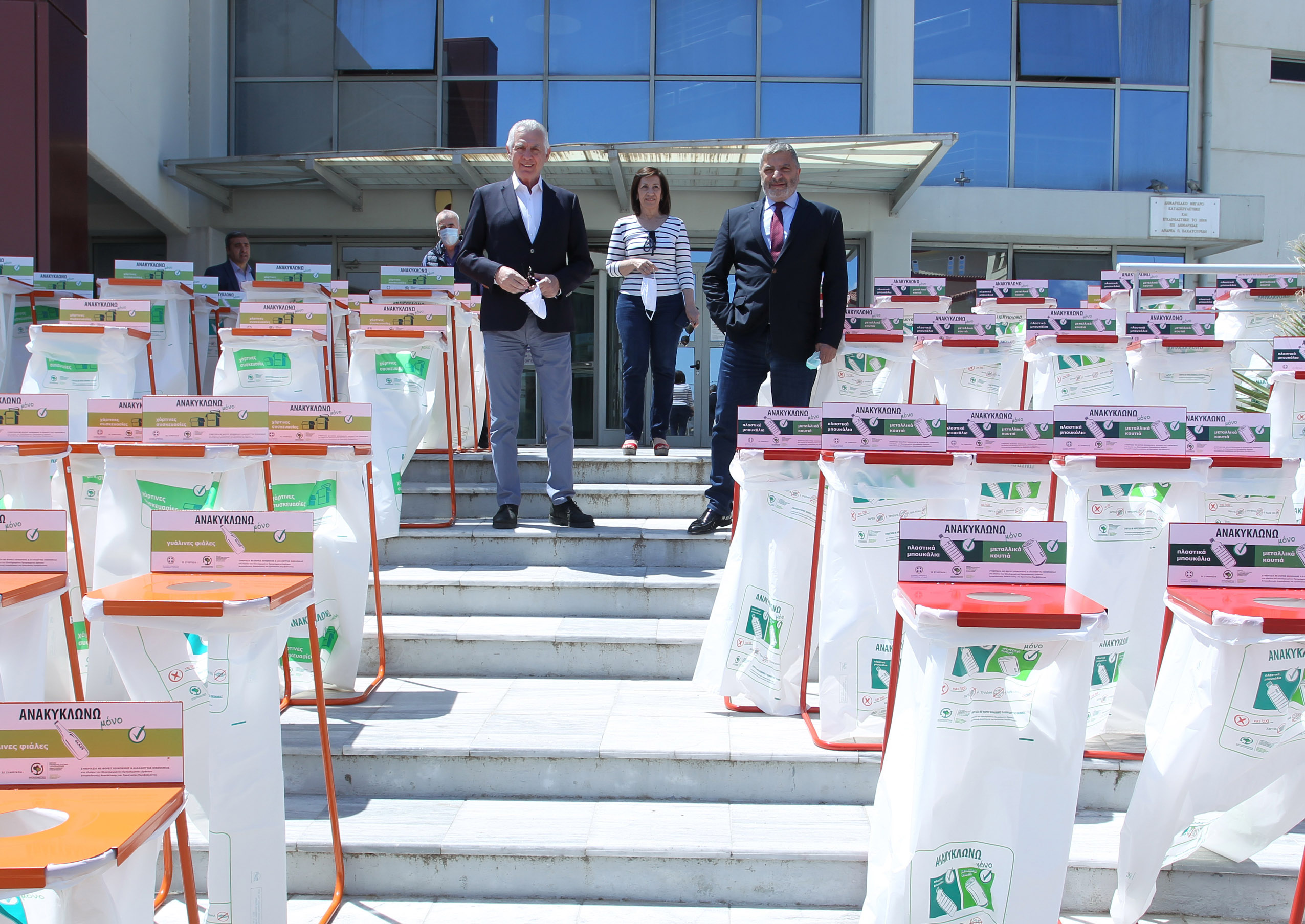 Ο Περιφερειάρχης Αττικής Γ. Πατούλης προχώρησε σήμερα στην παράδοση ειδικών κάδων εσωτερικής ανακύκλωσης και χωριστής συλλογής πλαστικών, μεταλλικών και χάρτινων συσκευασιών, στους Δημάρχους Περιστερίου Α. Παχατουρίδη και Ιλίου Ν. Ζενέτο.