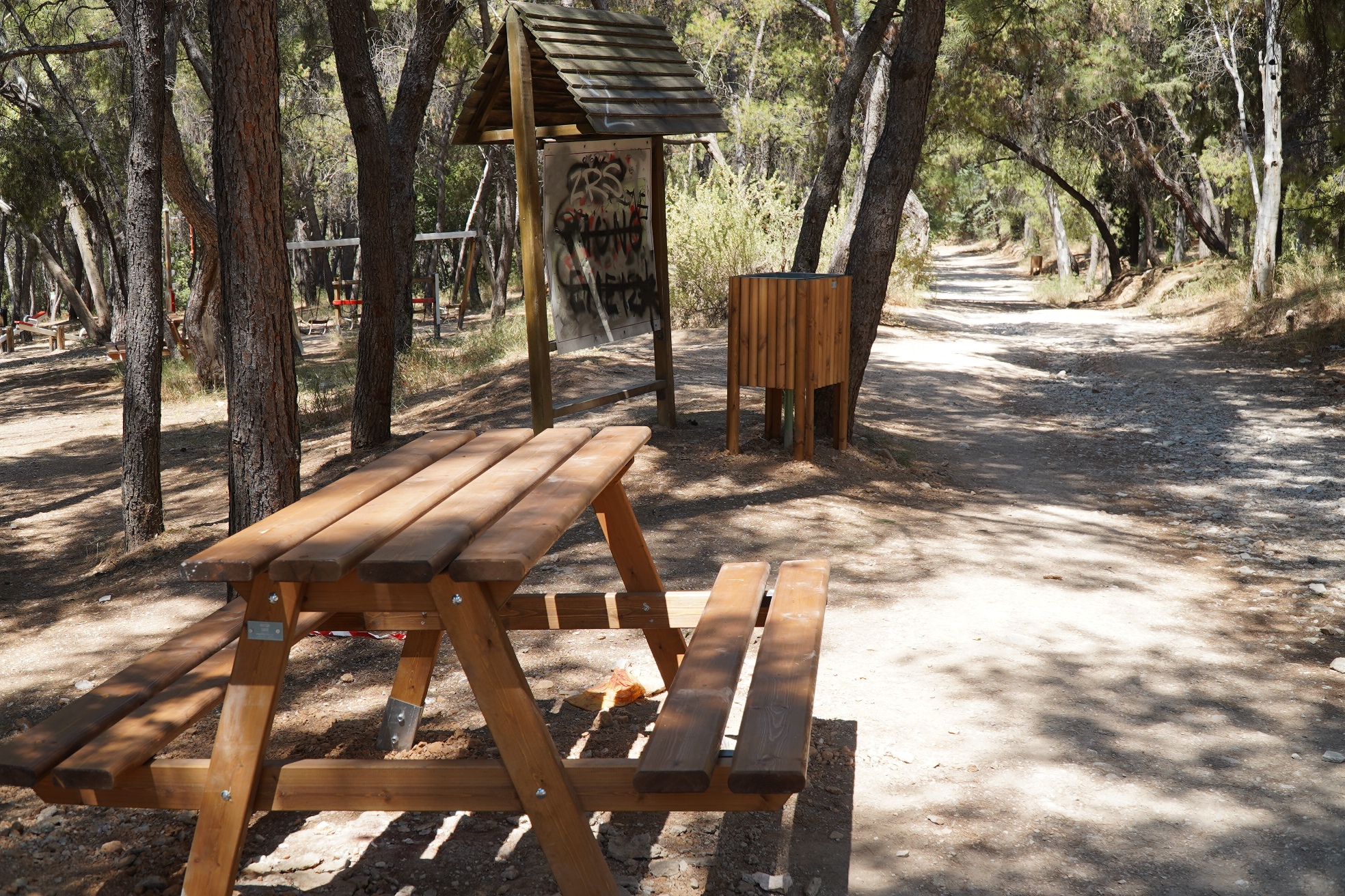 α) τα τραπέζια με τον διπλό πάγκο όπου κάνουν πικ-νικ οι οικογένειες,