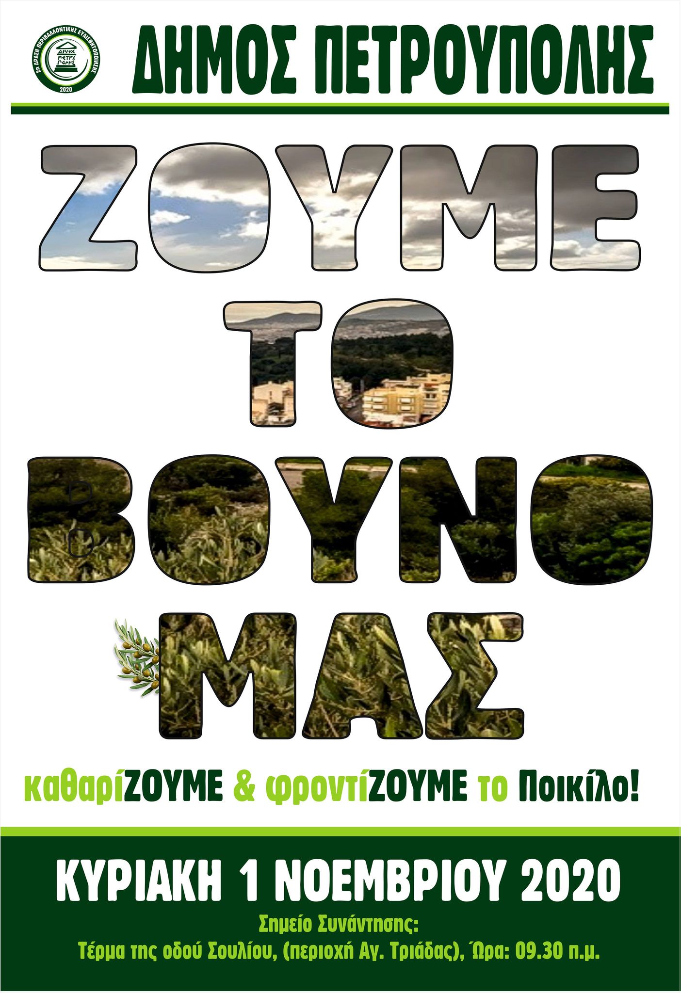 Σας περιμένουμε όλους την Κυριακή 1 Νοεμβρίου και ώρα 9:30 π.μ. στην περιοχή της Αγίας Τριάδας Πετρούπολης (τέρμα της οδού Σουλίου), για να καθαρίσουμε και να προστατεύσουμε τον μοναδικό «Πνεύμονα» της πόλης μας, το Ποικίλο Όρος.