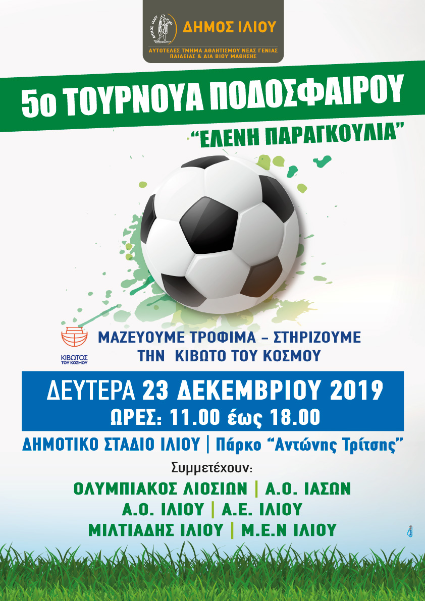 Το 5ο Φιλανθρωπικό Τουρνουά Ποδοσφαίρου «Ελένη Παραγκούλια» διοργανώνει τη Δευτέρα 23 Δεκεμβρίου 2019, το Τμήμα Αθλητισμού Νέας Γενιάς Παιδείας & Δια Βίου Μάθησης και η Διεύθυνση Κοινωνικής Προστασίας και Υγείας Δήμου Ιλίου.