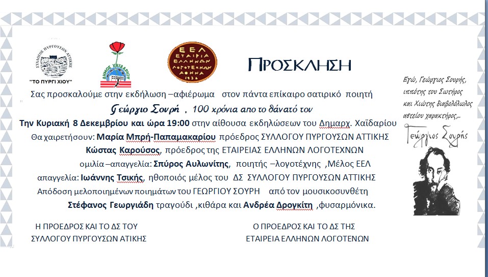 Εκδήλωση – αφιέρωμα στον σατιρικό ποιητή Γιώργο Σουρή, 100 χρόνια από τον θάνατο του, συνδιοργανώνουν ο Δήμος Χαϊδαρίου, η Εταιρεία Ελλήνων Λογοτεχνών και ο Σύλλογος Πυργουσών Αττικής.
