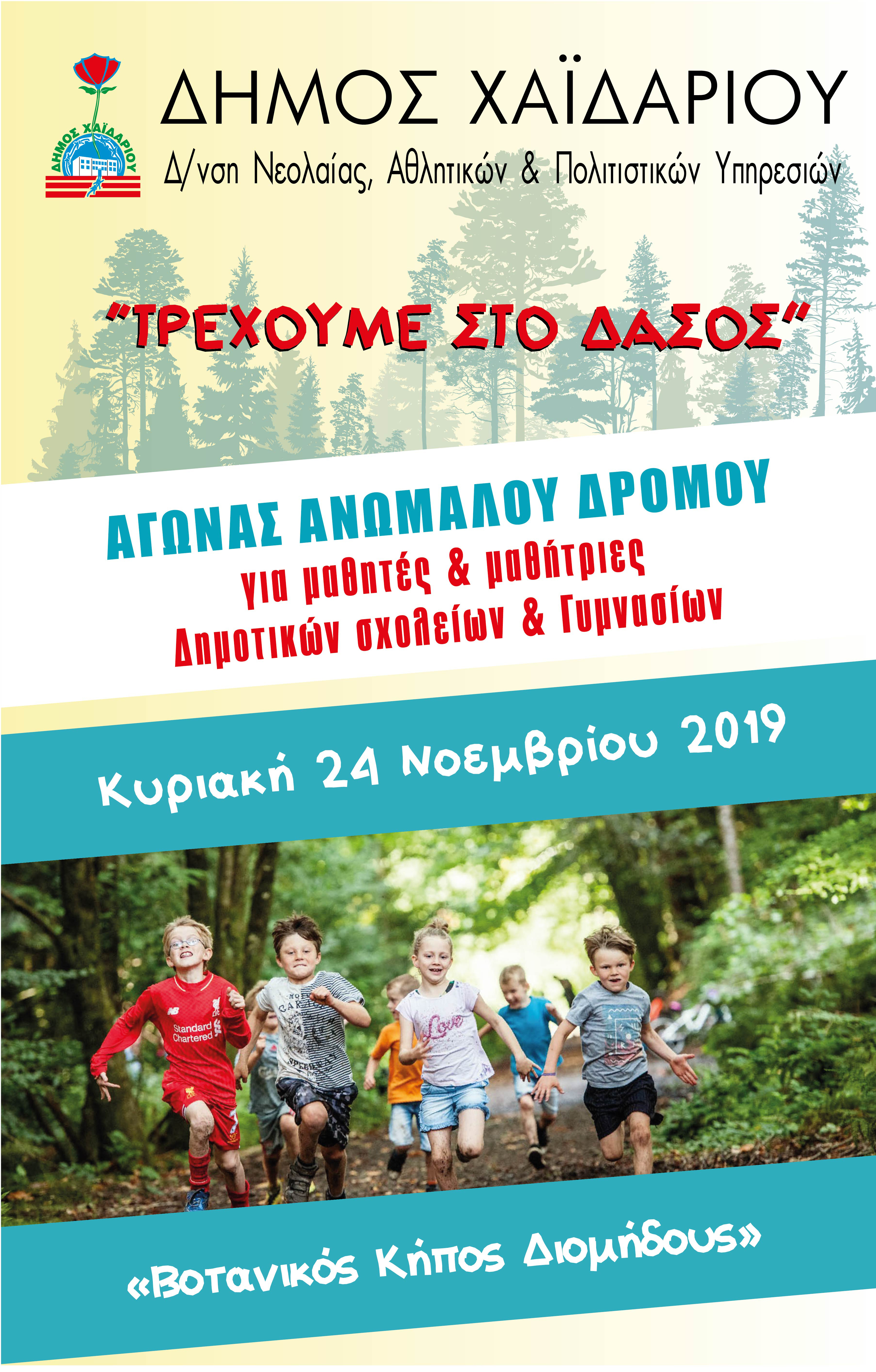Η Διεύθυνση Νεολαίας, Αθλητικών & Πολιτιστικών Υπηρεσιών, του Δήμου Χαϊδαρίου, διοργανώνει την Κυριακή 24 Νοεμβρίου 2019 στον « Διομήδειο Βοτανικό Κήπο», Αγώνα Ανωμάλου Δρόμου, για μαθητές και μαθήτριες Δημοτικών Σχολείων (Γ'-Δ'-Ε' & ΣΤ' Τάξης), και Γυμνασίων της πόλης μας.