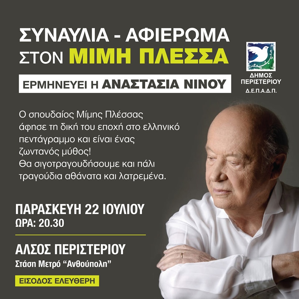 Άλσος Περιστερίου: Μεγάλη συναυλία αφιέρωμα στον Μίμη Πλέσσα Από life 0 Σχόλιοs Σήμερα Παρασκευή 22 Ιουλίου, ώρα 20:30, στο Άλσος Περιστερίου. NEWS 24 Συντάκτης Δημοσιογραφική ομάδα LIFE