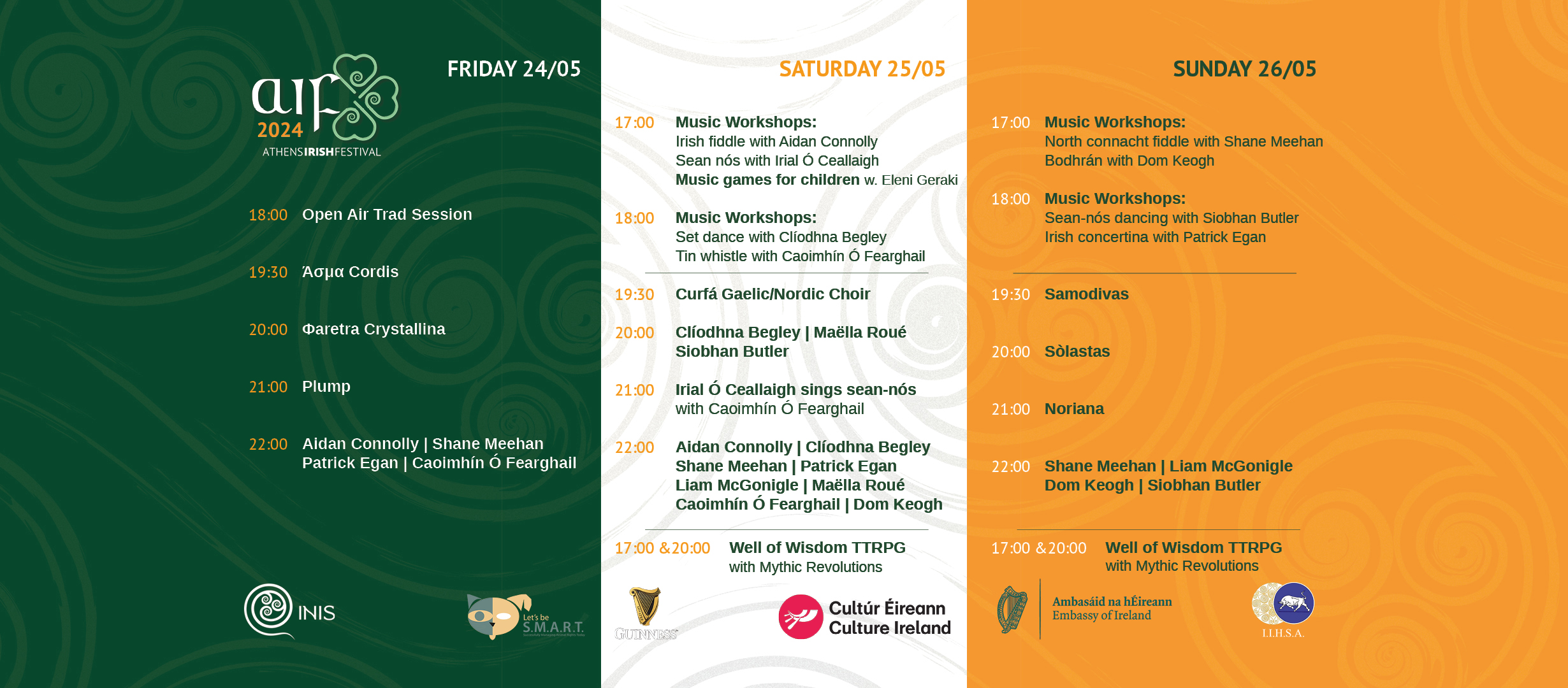Το Σάββατο 25 Ιουνίου θα ξεκινήσουμε από νωρις με μουσικοκινητικά παιχνίδια για παιδιά εμπνευσμένα από τα Ιρλανδικά έθιμα με την παιδαγωγό Ελένη Γεράκη. Έπειτα, θα ταξιδέψουμε στην Ιρλανδία, τη Σκωτία και τα Απαλλάχια όρη με τραγούδια για την αγάπη, τη θάλασσα, την ποιμενική ζωή και την φύση με τη χορωδία Curfá . Θά πάρει τη σκυτάλη ένα γυναικείο μουσικό σύνολο από την Ιρλανδία, με την Clíodhna Begley στη βιόλα, την Maëlla Roué Demians από τη Βρετάνη στο φλάουτο και την Siobhan Butler σε αυτοσχεδιαστικό χορό Sean Nós. Στη συνέχεια ο Irial O’Ceallaigh θα μας μαγέψει με παραδοσιακά Ιρλανδικά τραγούδια Sean Nós με την οργανική συνοδεία του Caoimhín Ó Fearghail. Η βραδιά θα κορυφωθεί με όλους τους Ιρλανδούς μουσικούς να ανεβαίνουν στη σκηνή για μία ανεπανάληπτη ιρλανδική φίεστα! Μουσικοί που θα εμφανιστούν: Aidan Connolly, Shane Meehan,Clíodhna Begley, Caoimhín Ó Fearghail, Dom Keogh, Irial O’ Ceallaigh, Patrick Egan, Liam McGoniggle, Maëlla Roué Demians και η Siobhan Butler στον χορό.