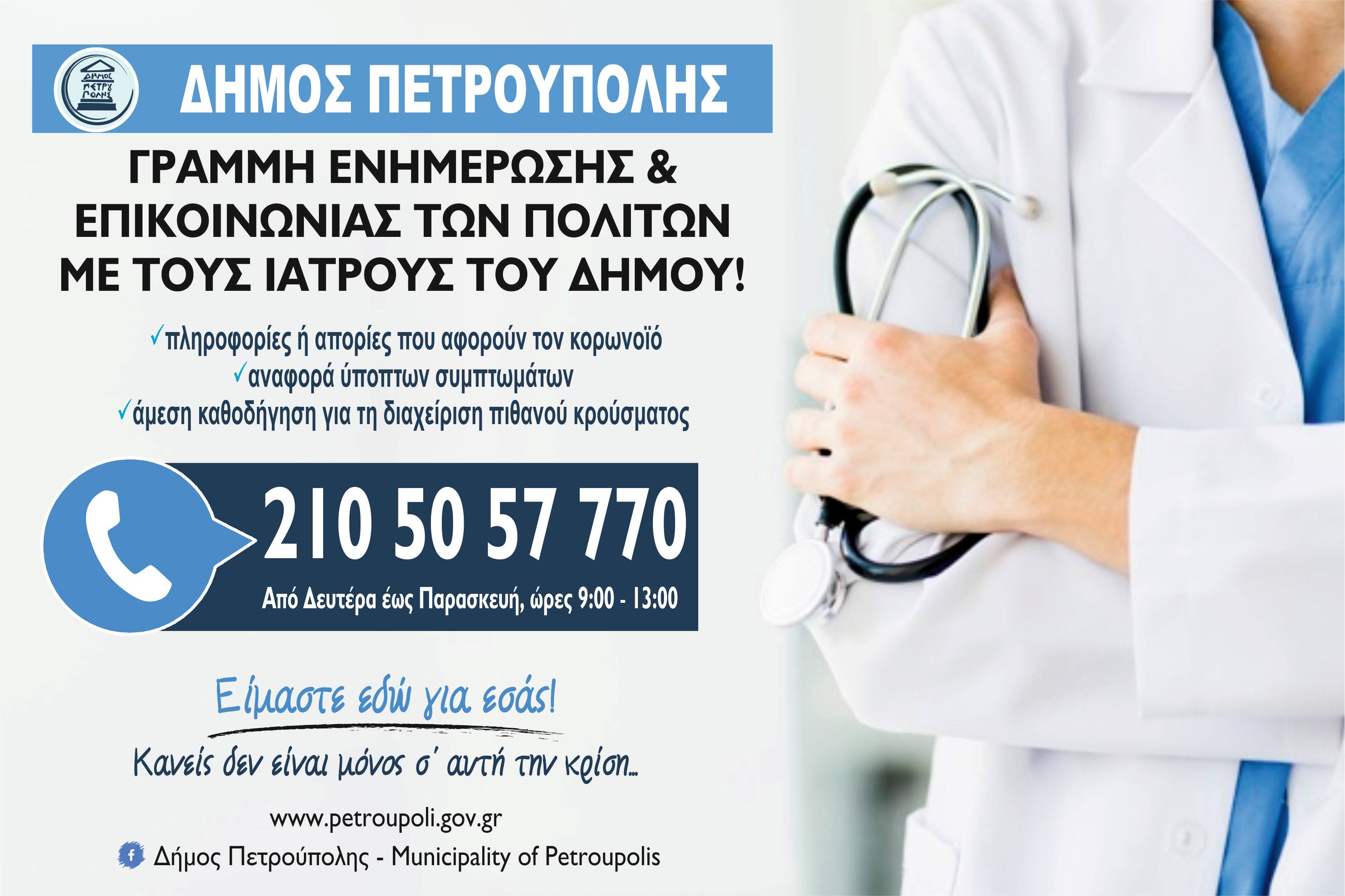 Η «Γραμμή ενημέρωσης και επικοινωνίας των πολιτών με τους ιατρούς του Δήμου» θα λειτουργεί καθημερινά, από Δευτέρα έως Παρασκευή και ώρες 9:00 έως 13:00 στο τηλέφωνο 210 5057770.