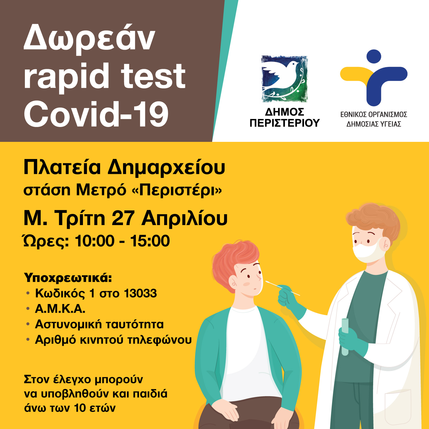 Ο Δήμος Περιστερίου σε συνεργασία με τον Εθνικό Οργανισμό Δημόσιας Υγείας (ΕΟΔΥ), θα πραγματοποιήσει δωρεάν ελέγχους ταχείας ανίχνευσης (rapid test) κορονοϊού για τους κατοίκους της πόλης, τη Μεγάλη Τρίτη 27 Απριλίου 2021, ώρες 10:00 – 15:00, στην πλατεία Δημαρχείου – στάση Μετρό «Περιστέρι».