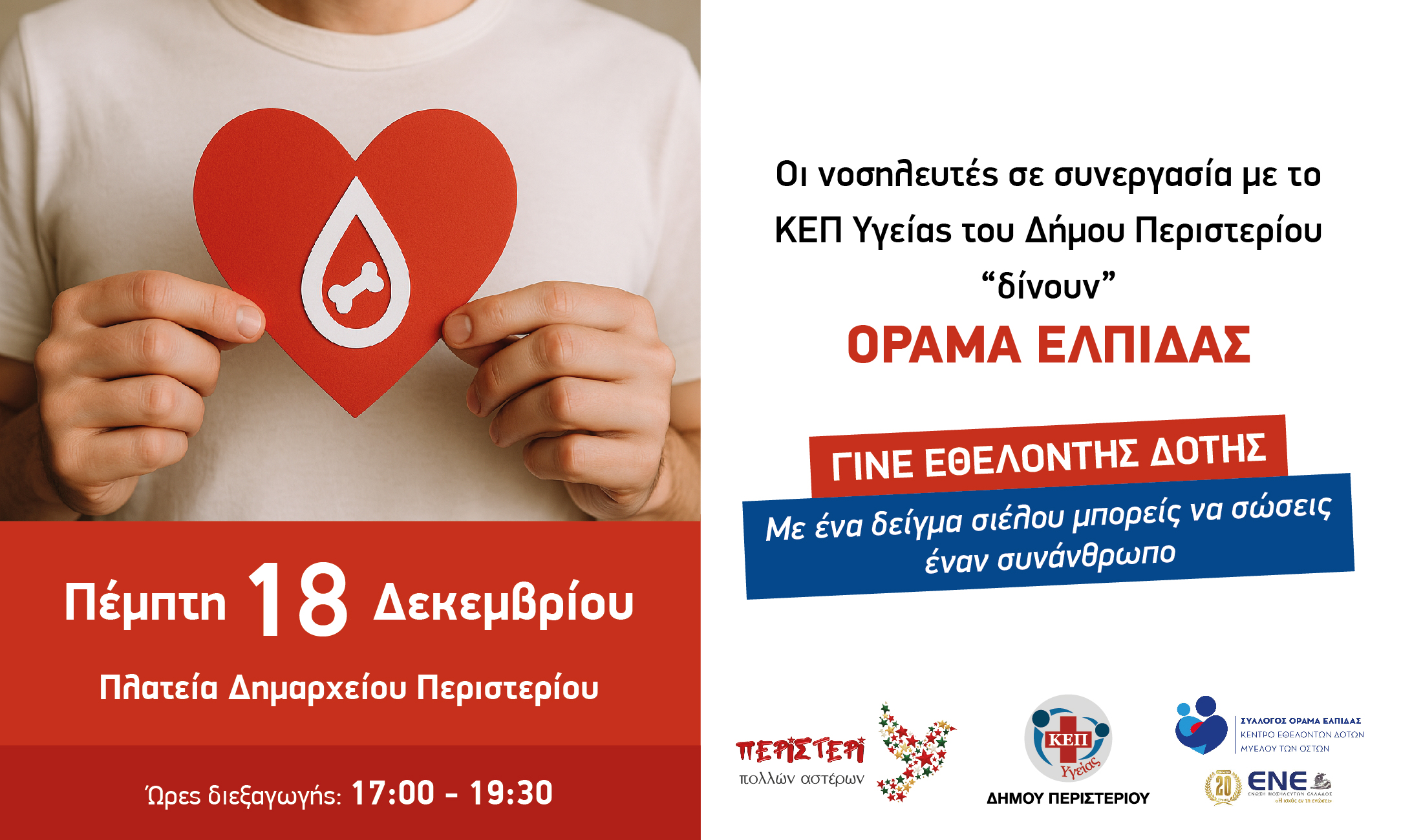 Οι νοσηλευτές, σε συνεργασία με το ΚΕΠ Υγείας του Δήμου Περιστερίου, καλούν τους πολίτες να εγγραφούν ως εθελοντές δότες μυελού των οστών, προσφέροντας ελπίδα ζωής σε συνανθρώπους μας, με ένα απλό και ανώδυνο δείγμα σιέλου. Ώρες διεξαγωγής: 17:00 – 19:30.