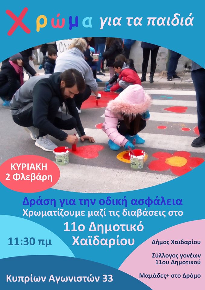 Την Κυριακή 2 Φεβρουαρίου στις 11:30 οι «Μαμάδες στο Δρόμο» και ο Σύλλογος Γονέων 11ου Δημοτικού σε συνεργασία με τον Δήμο Χαϊδαρίου χρωματίζουμε τις διαβάσεις δρόμων στο 11ο Δημοτικό Σχολείο (Κυπρίων Αγωνιστών 33).