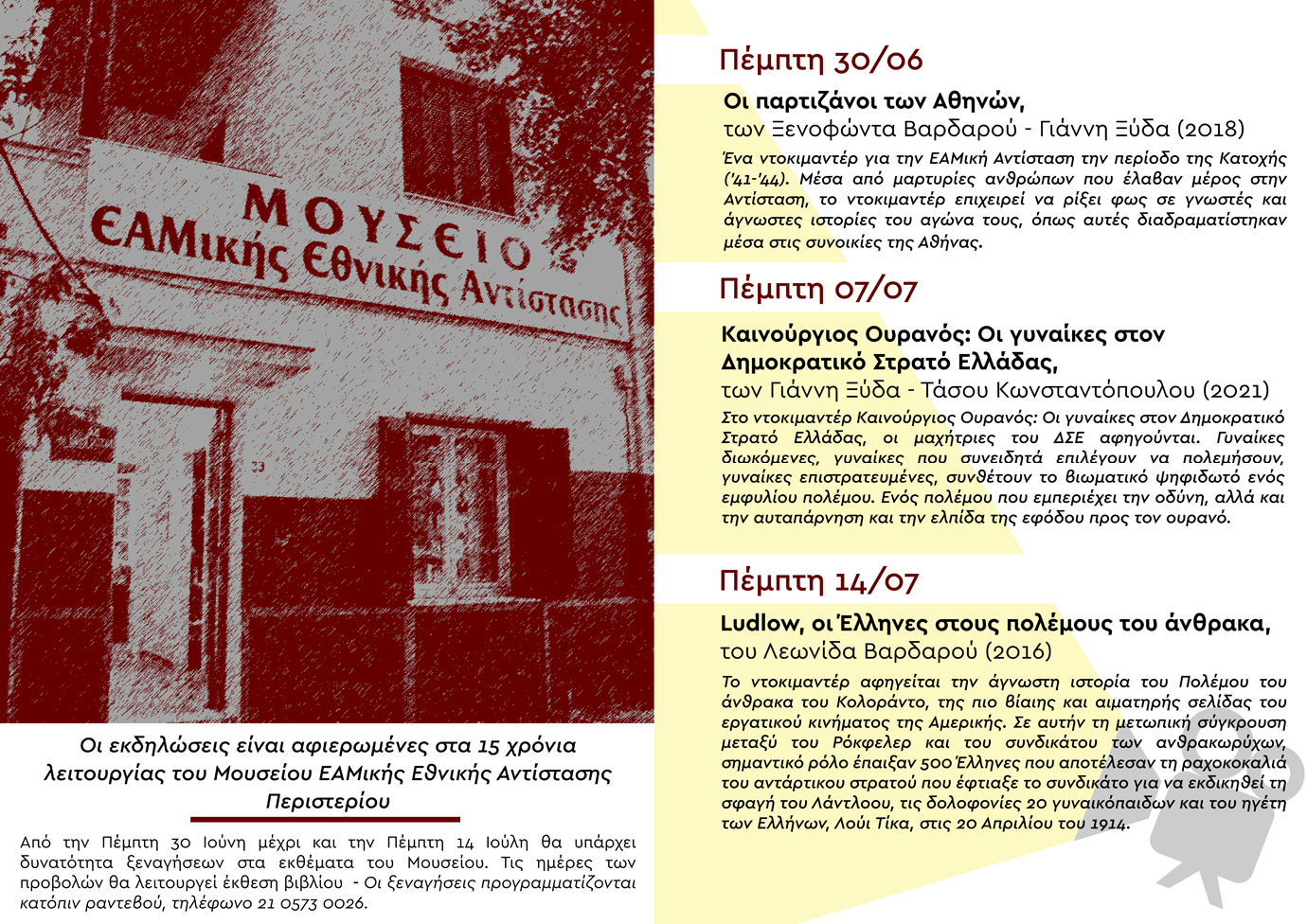Με αφορμή την συμπλήρωση 15 χρόνων από την ίδρυση του Μουσείου ΕΑΜικής Εθνικής Αντίστασης (Περιστέρι), ακολουθεί το πρόγραμμα των εκδηλώσεων που θα πραγματοποιηθούν στον χώρο του Μουσείου από τις 30/06 έως 14/07/2022!