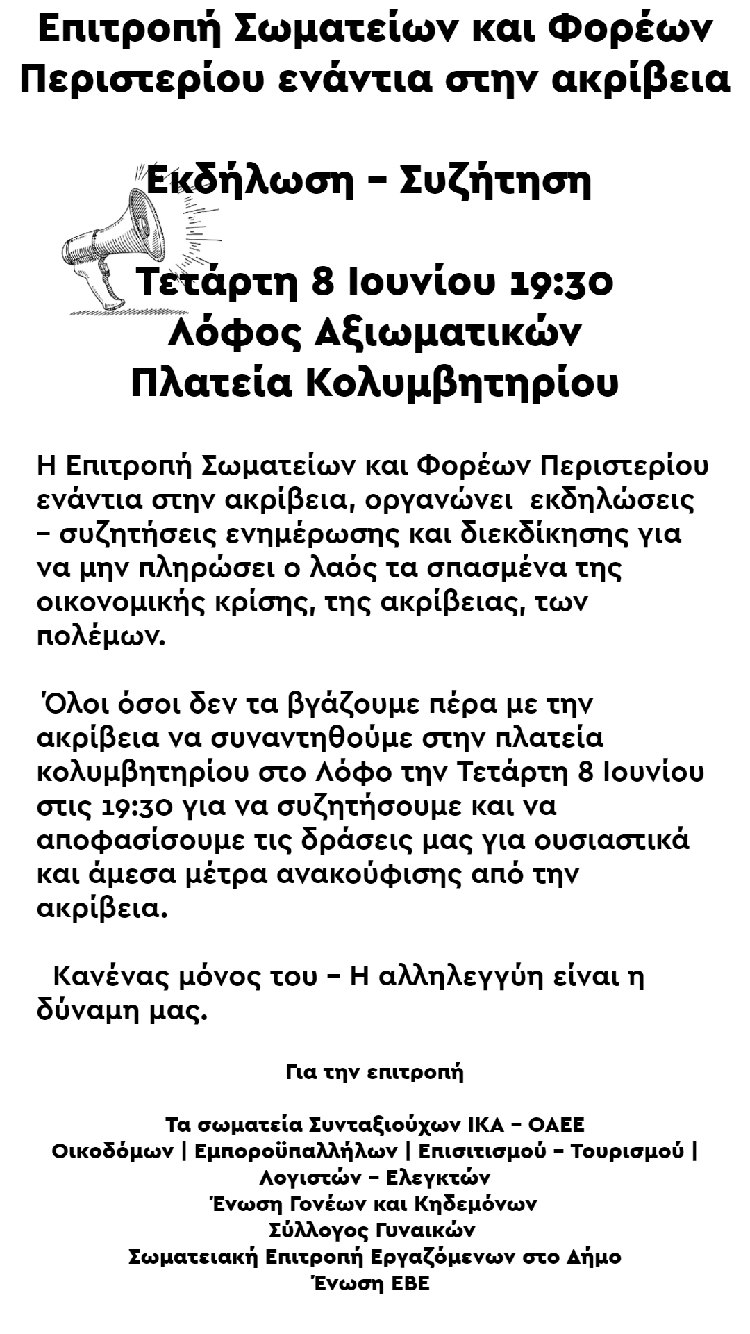 Η Επιτροπή Σωματείων και Φορέων Περιστερίου ενάντια στην ακρίβεια, οργανώνει εκδηλώσεις – συζητήσεις ενημέρωσης και διεκδίκησης για να μην πληρώσει ο λαός τα σπασμένα της οικονομικής κρίσης, της ακρίβειας, των πολέμων.