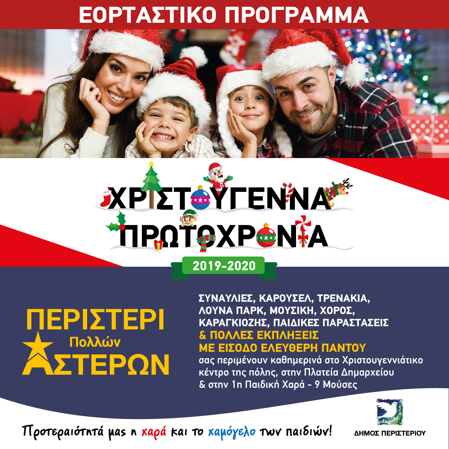 Μικροί και μεγάλοι από τις 6 Δεκεμβρίου 2019 μέχρι και τις 6 Ιανουαρίου 2020 μπορούν να διασκεδάσουν ΔΩΡΕΑΝ στις 422 εορταστικές εκδηλώσεις και δράσεις! Από τις 11 το πρωί μέχρι τις 10 το βράδυ στην Πλατεία Δημαρχείου (σταθμός Μετρό "Περιστέρι") με το Carousel, το Λούνα Παρκ, τα Γιορτινά Τρενάκια, την ωραιότερη Φάτνη της Αττικής και στην 1η Παιδική Χαρά - 9 Μούσες με το εορταστικό Καραβάκι και το "Σπίτι του Αϊ Βασίλη"!!!