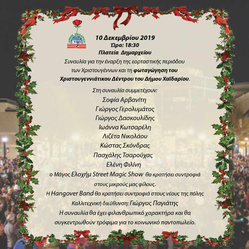 Την Τρίτη 10 Δεκεμβρίου στις 6:30 το απόγευμα στην Πλατεία Δημαρχείου θα φωταγωγηθεί το Χριστουγεννιάτικο Δέντρου του Δήμου Χαϊδαρίου, δίνοντας το σήμα έναρξης της εορταστικής περιόδου στην πόλη.