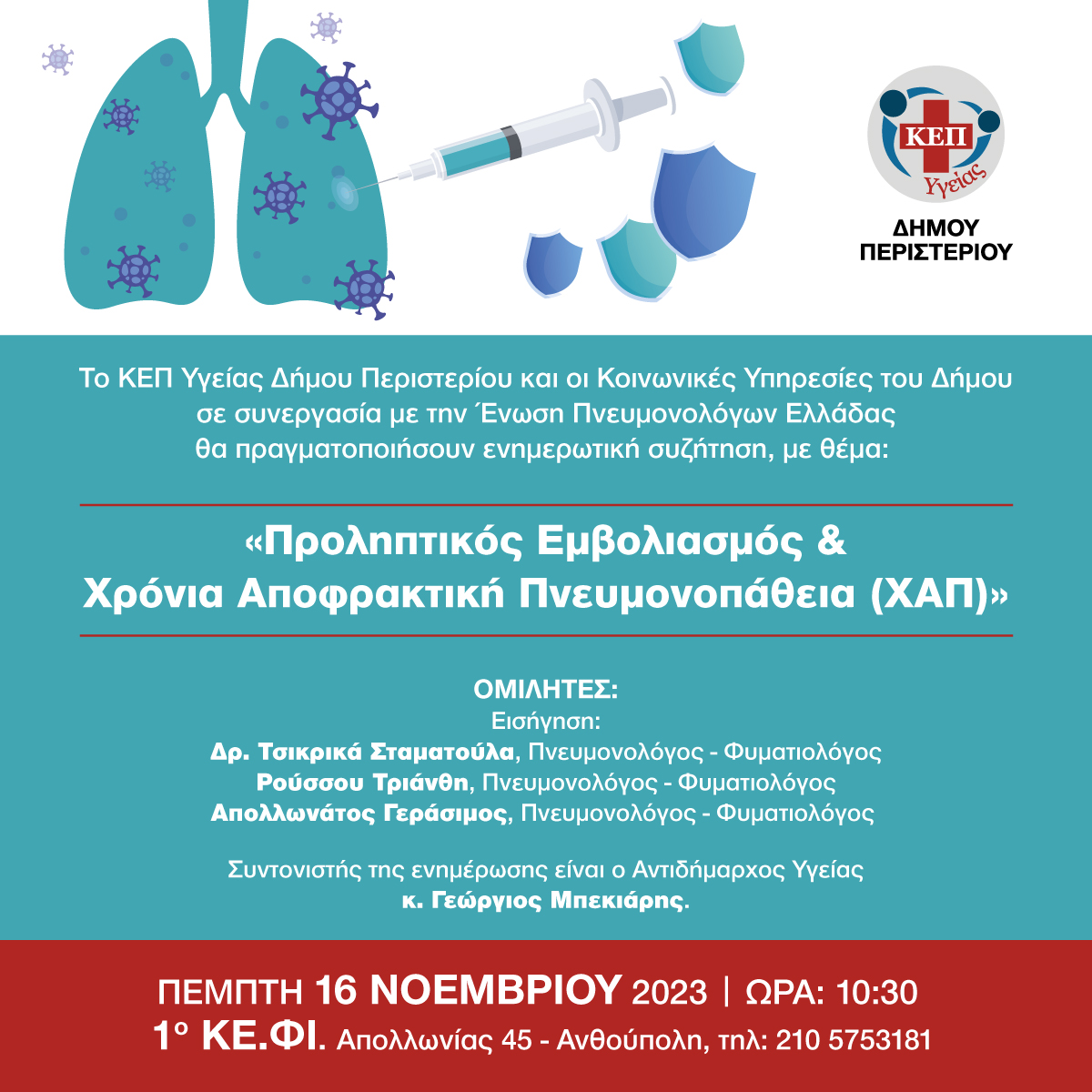 Το ΚΕΠ Υγείας Δήμου Περιστερίου και οι Δημοτικές Κοινωνικές Υπηρεσίες, σε συνεργασία με την Ένωση Πνευμονολόγων Ελλάδας θα πραγματοποιήσουν ενημερωτικές συζητήσεις στα Κέντρα Φιλίας (ΚΕ.ΦΙ.), με θέμα: «Προληπτικός Εμβολιασμός & Χρόνια Αποφρακτική Πνευμονοπάθεια (ΧΑΠ)», με συντονιστή τον Αντιδήμαρχο Υγείας Γεώργιο Μπεκιάρη.