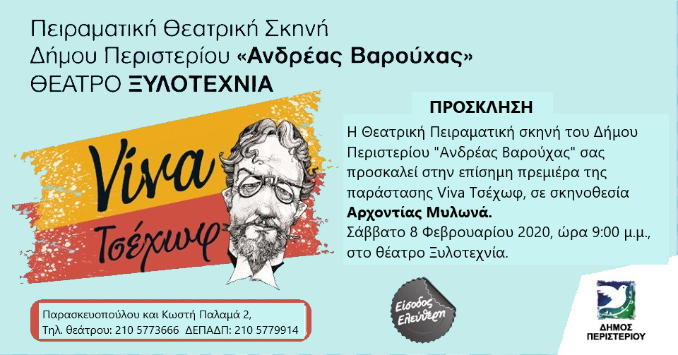 Η πρεμιέρα της παράστασης "Viva Τσέχωφ" σε σκηνοθεσία της Αρχοντίας Μυλωνά θα πραγματοποιηθεί το Σάββατο 8 Φεβρουαρίου 2020 στο θέατρο Ξυλοτεχνίας στο Περιστέρι.