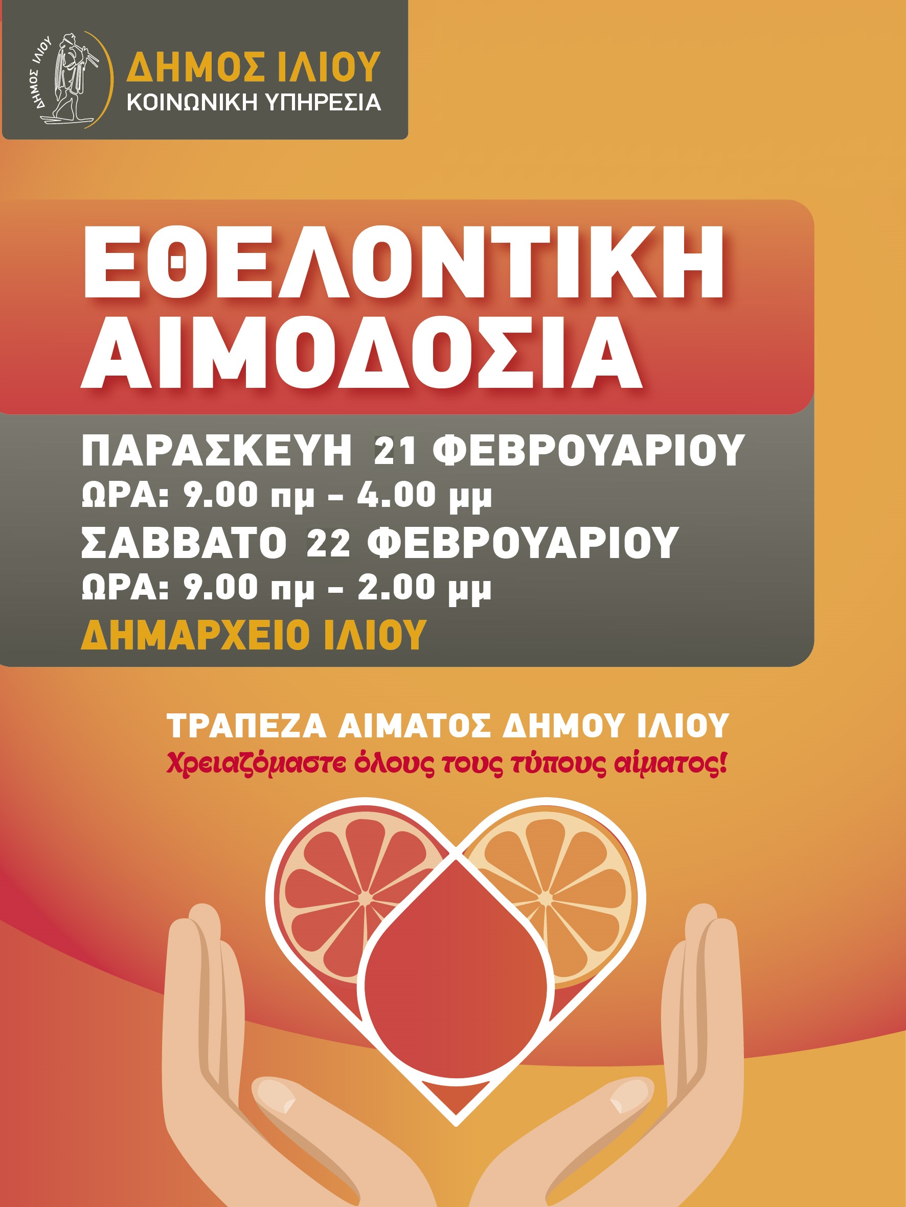 Εθελοντική αιμοδοσία οργανώνει ο Δήμος Ηλίου στις 21 και στις 22 Φεβρουαρίου 2020. Την Παρασκευή 21 Φεβρουαρίου η αιμοδοσία θα διεξαχθεί τις ώρες 9 π.μ. - 4 μ.μ. και το Σάββατο 22 Φεβρουαρίου 9.00 π.μ. - 2 μμ. στο Δημαρχείο Ιλίου.