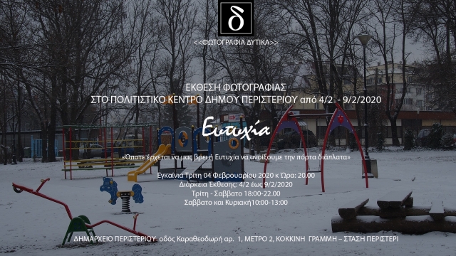Η ομάδα Φωτοδυτικά σας προσκαλεί στον εκθεσιακό χώρο του Δημαρχιακού Μεγάρου του Δήμου Περιστερίου, στην έκθεση φωτογραφίας με θέμα: «Ευτυχία»