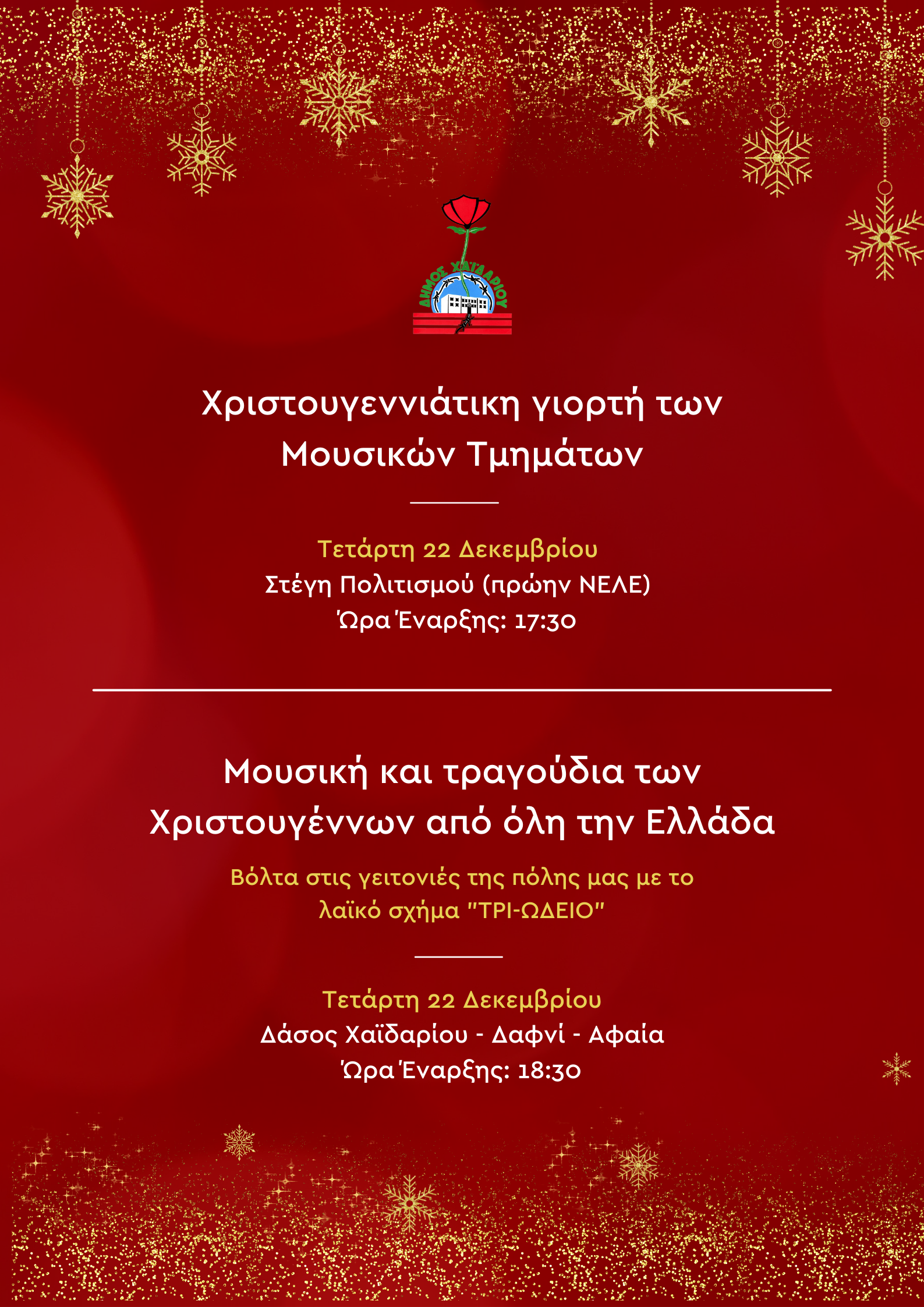 Χαϊδάρι: Χριστουγεννιάτικη γιορτή των μουσικών τμημάτων Από life 0 Σχόλιοs Τραγούδια Χριστουγέννων και μουσική στον δήμο Χαιδαρίου. NEWS 24 Συντάκτης Δημοσιογραφική ομάδα LIFE
