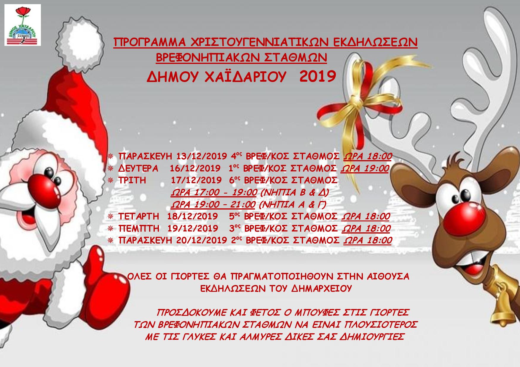 Χριστουγεννιάτικες εκδηλώσεις Βρεφονηπιακών Σταθμών στο Χαϊδάρι Από life 0 Σχόλιοs Πρόγραμμα Χριστουγεννιάτικων εκδηλώσεων Βρεφονηπιακών Σταθμών Δήμου Χαϊδαρίου NEWS 24 Συντάκτης Δημοσιογραφική ομάδα LIFE