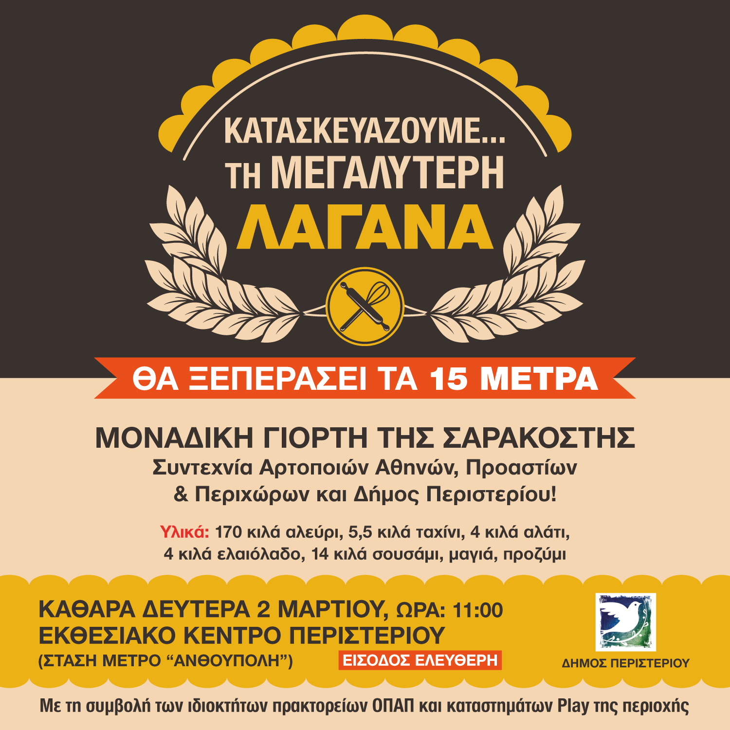 Η Συντεχνία Αρτοποιών Αθηνών, Προαστίων & Περιχώρων και ο Δήμος Περιστερίου σε μια μοναδική γιορτή της Σαρακοστής, θα δημιουργήσουν τη μεγαλύτερη Λαγάνα, που αναμένεται να ξεπεράσει τα 15 μέτρα. Στην πρωτοβουλία αυτή, συμβάλλουν ιδιοκτήτες πρακτορείων ΟΠΑΠ και καταστημάτων Play της περιοχής.