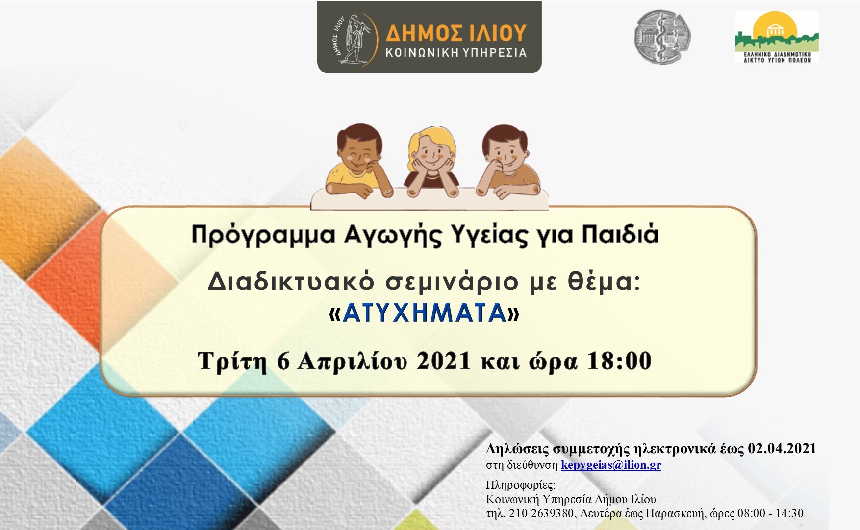 Ο Δήμος Ιλίου ενημερώνει για την έναρξη του διαδικτυακού Προγράμματος Αγωγής Υγείας για Παιδιά, που υλοποιείται σε συνεργασία με το Ελληνικό Διαδημοτικό Δίκτυο Υγιών Πόλεων -Προαγωγής Υγείας  (ΕΔΔΥΠΠΥ), υπό την Αιγίδα του ΙΣΑ, με την υποστήριξη του κ. Αναστάσιου Χατζή, Παιδίατρου – Εντατικολόγου, τ. Συντονιστή – Διευθυντή ΜΕΘ Νοσοκομείου Παίδων «Η ΑΓΙΑ ΣΟΦΙΑ» και μέλος ΔΣ του Ιατρικού Συλλόγου Αθηνών.