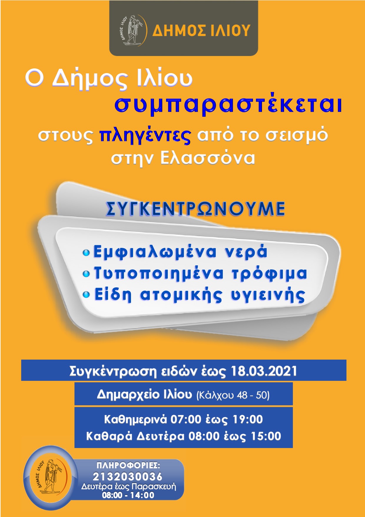 Ο Δήμος Ιλίου επιδεικνύει την έμπρακτη συμπαράστασή του στους πληγέντες από τις ισχυρές σεισμικές δονήσεις στην Ελασσόνα και καλεί όσους πολίτες επιθυμούν να συνεισφέρουν στην προσπάθεια συγκέντρωσης τροφίμων και ειδών πρώτης ανάγκης, προκειμένου να βοηθήσουμε τους συνανθρώπους μας που δοκιμάζονται.