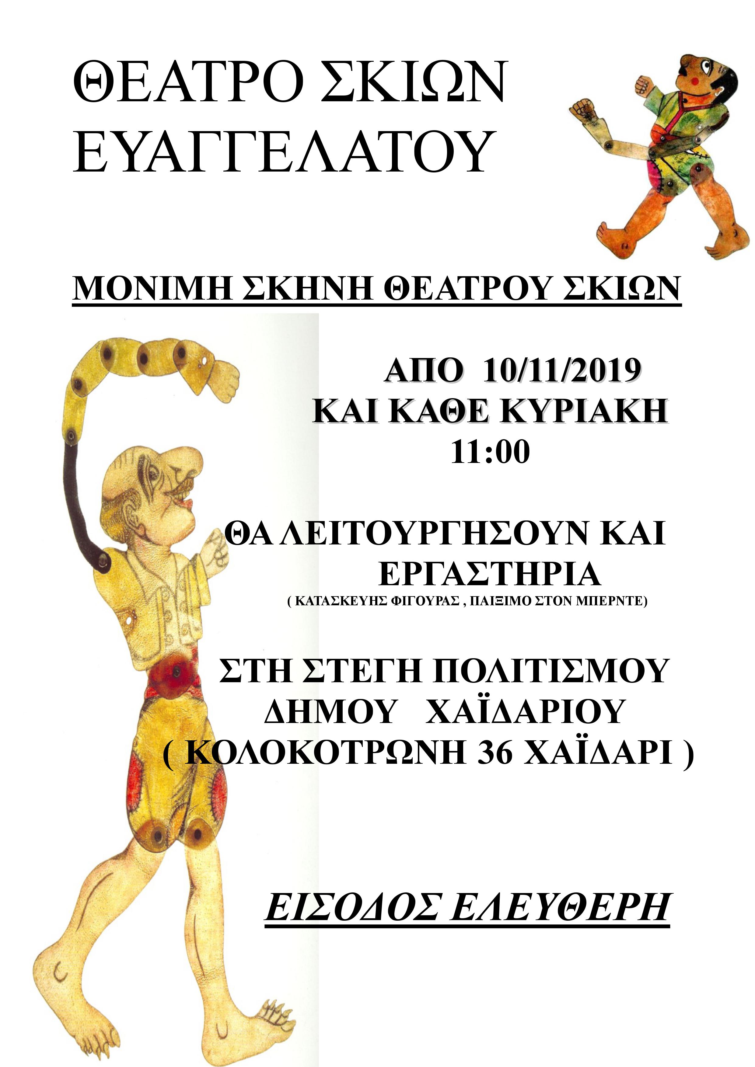 Ο Δήμος Χαϊδαρίου και το τμήμα Πολιτισμού βρίσκεται στην ευχάριστη θέση να ανακοινώσει τη δημιουργία μόνιμης σκηνής θεάτρου Σκιών καθώς και εργαστηρίου κατασκευής φιγούρας και παιξίματος στον μπερντέ.