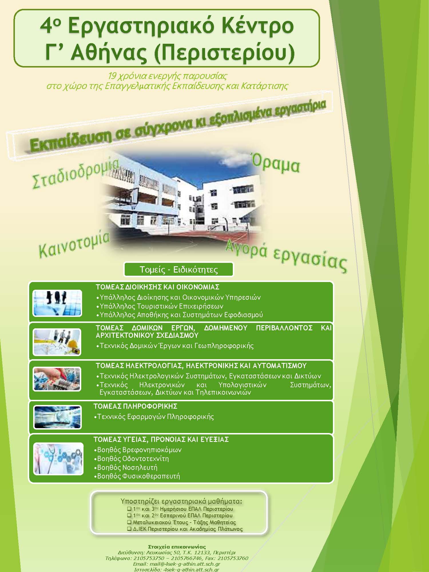 Στο 4ο Εργαστηριακό Κέντρο (Ε.Κ.) Περιστερίου, πραγματοποιούνται εργαστηριακά μαθήματα των Τομέων και Ειδικοτήτων των ΕΠΑΛ (1ου & 3ου ημερήσιου ΕΠΑΛ Περιστερίου και 1ου & 2ου εσπερινού ΕΠΑΛ Περιστερίου) και Δ.ΙΕΚ. (Περιστερίου και Ακαδημίας Πλάτωνος). Λειτουργούν άρτια εξοπλισμένα εργαστήρια, με άριστη υλικοτεχνική υποδομή και με σύγχρονο οπτικοακουστικό εξοπλισμό.