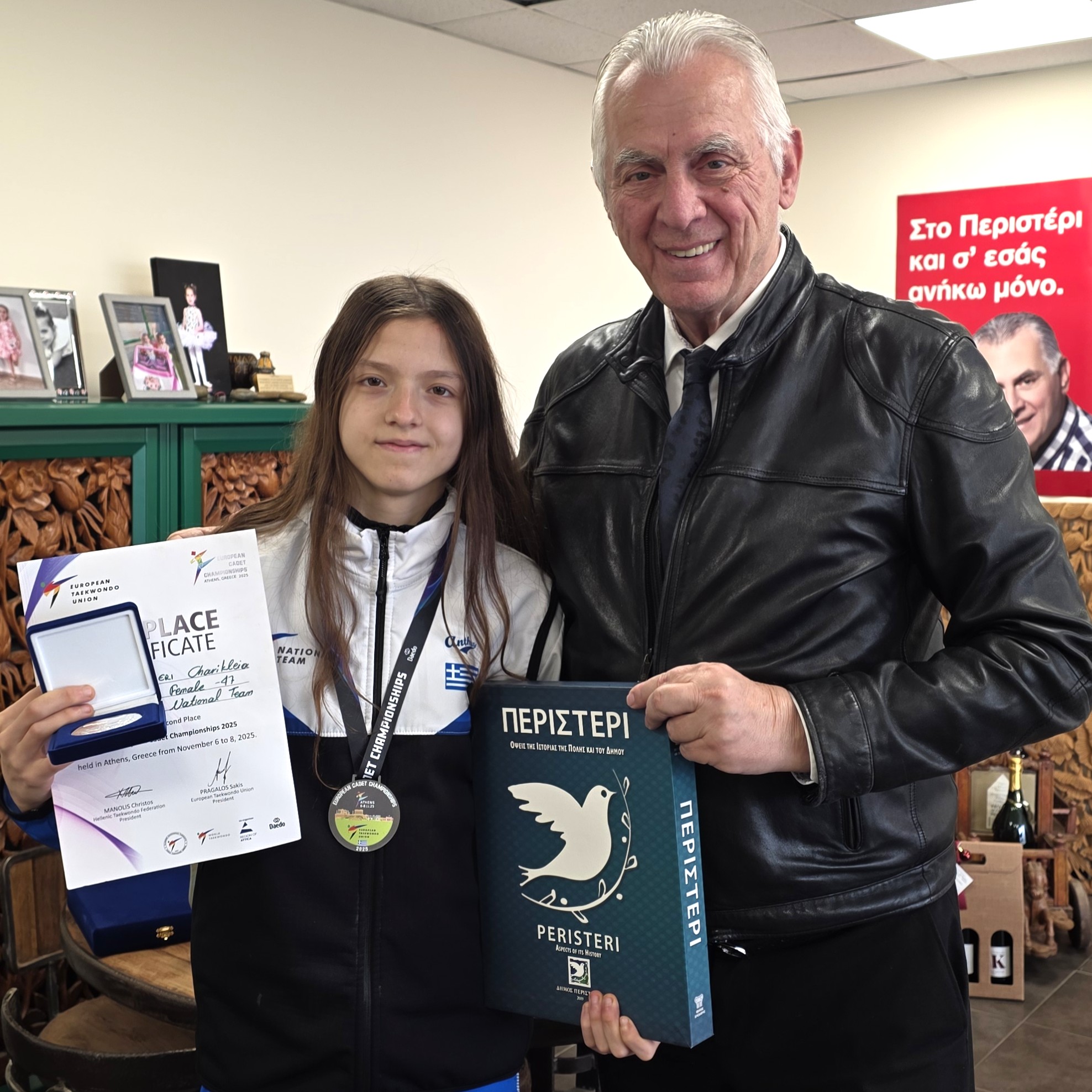 Ο Δήμαρχος Περιστερίου, Ανδρέας Π. Παχατουρίδης, υποδέχθηκε τη Δευτέρα 26 Ιανουαρίου 2026 στο Δημαρχιακό Μέγαρο τη νεαρή Περιστεριώτισσα αθλήτρια Χαρίκλεια Σεφέρη και τη τίμησε για την εξαιρετική της επιτυχία στο Ευρωπαϊκό Πρωτάθλημα Taekwondo Κορασίδων 2025.