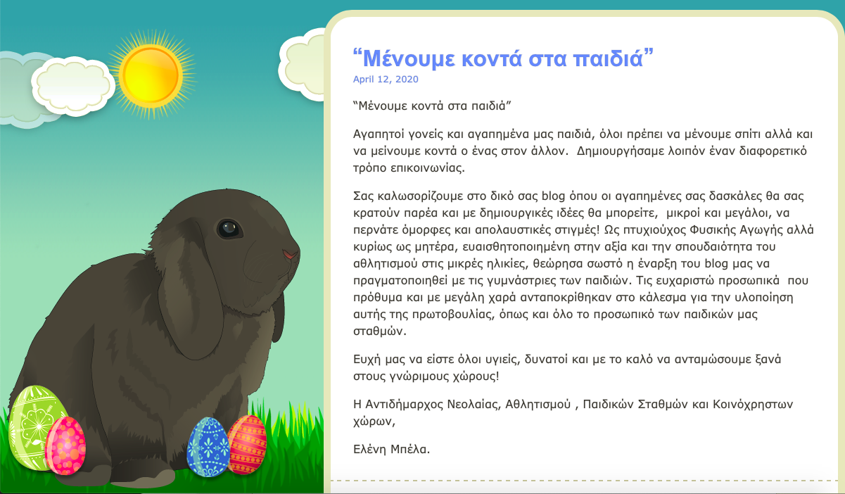 “Έγινε πράξη άλλη μια λειτουργία του Δήμου Χαϊδαρίου για την εξυπηρέτηση των κατοίκων μέσα στις συνθήκες της κοινωνικής αποστασιοποίησης. Τα μικρά παιδιά είναι ευαίσθητα σε κάθε αλλαγή και η φροντίδα που τους προσφέρουμε αυτό τον καιρό πρέπει να είναι αυξημένη. Το blog των Δημοτικών Παιδικών Σταθμών θα είναι ένας πολύτιμος βοηθός για τους γονείς και κηδεμόνες και μια πηγή χαράς και διασκέδασης για τα παιδιά. Όλοι Μένουμε Σπίτι αλλά Κανένας δεν είναι μόνος του στο Χαϊδάρι”.