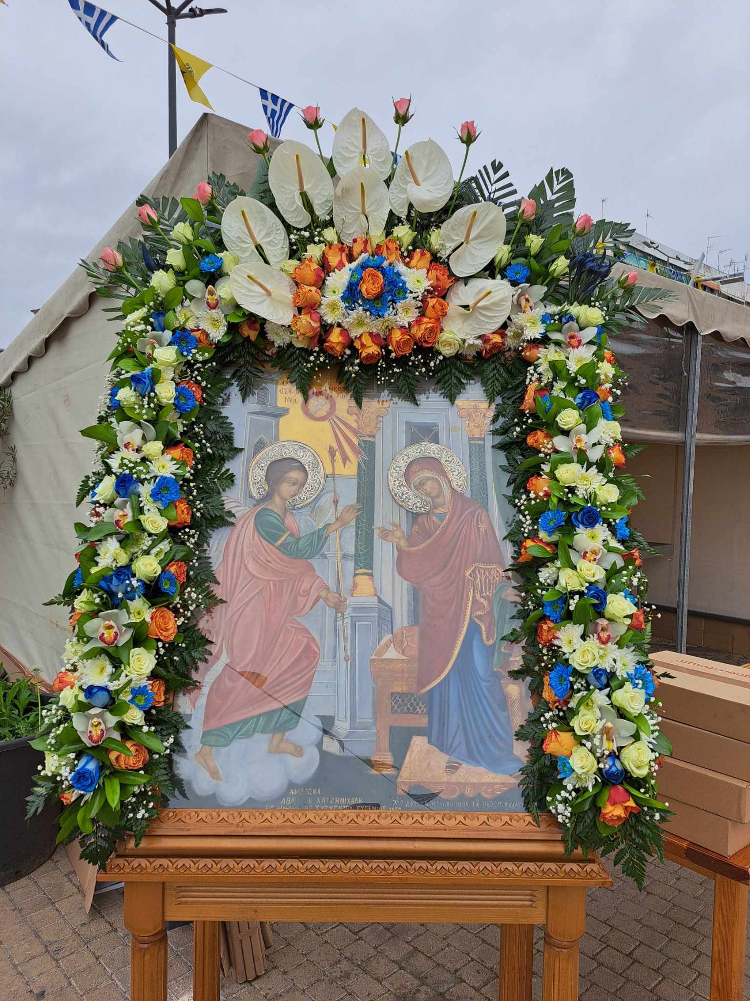 Σε μια συννεφιασμένη μέρα, οι πάγκοι στήθηκαν και όλα είναι έτοιμα για την αυριανή γιορτινή μέρα. Όσοι πιστοί προσέλθετε στο Περιστέρι και το μεγάλο πανηγύρι της εκκλησίας μας. Αύριο η μαθητική παρέλαση και η μεγάλη λειτουργία στην Ευαγγελίστρια.