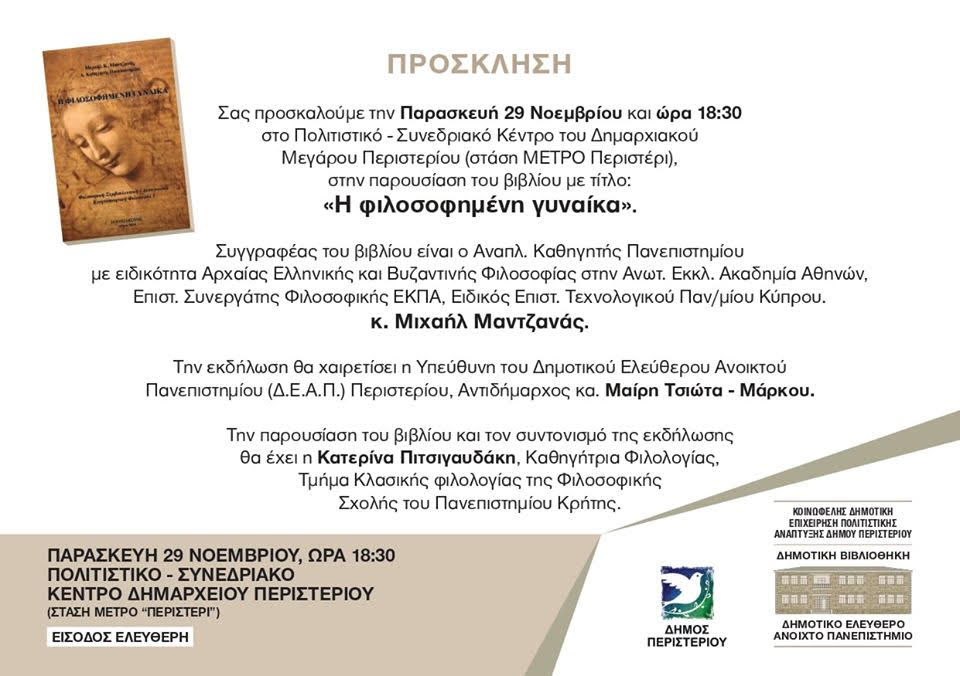 Την Παρασκευή 29 Νοεμβρίου, ώρα 18:30, θα πραγματοποιηθεί παρουσίαση του βιβλίου "Η φιλοσοφημένη γυναίκα" του Μιχαήλ Μαντζανά στο Πολιτιστικό-Συνεδριακό Μέγαρο του Δήμου Περιστερίου.