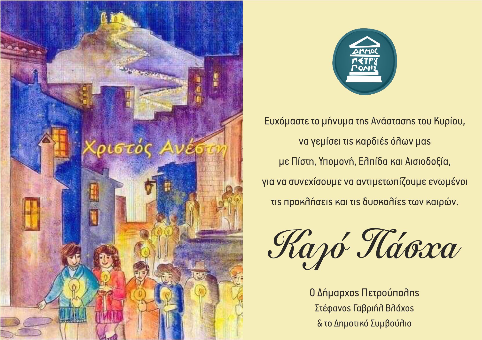 Πασχαλινές ευχές δημάρχου Πετρούπολης Από life 0 Σχόλιοs Οι πασχαλινές ευχές του Δημάρχου Πετρούπολης και του Δημοτικού Συμβουλίου Πετρούπολης NEWS 24 Συντάκτης Δημοσιογραφική ομάδα LIFE