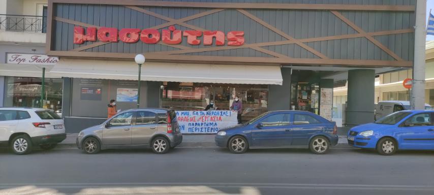 Ηχηρή παρέμβαση έξω από το κατάστημα Μασούτης στο Περιστέρι πραγματοποίησαν σήμερα μέλη του Συλλόγου Εμποροϋπαλλήλων Αθήνας, μετά από καταγγελία εργαζόμενων για πλήθος κρουσμάτων στο κατάστημα. Οι εργαζόμενοι καταγγέλλουν επίσης ότι δεν τηρούνται τα μέτρα προστασίας για την υγεία των εργαζομένων και οι υπεύθυνοι κρύβουν τα θετικά κρούσματα, για να μην σταματήσει η λειτουργία των καταστημάτων. Αυτό όχι μόνο θέτει σε άμεσο κίνδυνο την υγεία των εργαζόμενων αλλά και των καταναλωτών, αφού καθιστά τα super market εστίες υπερμετάδοσης του ιού.