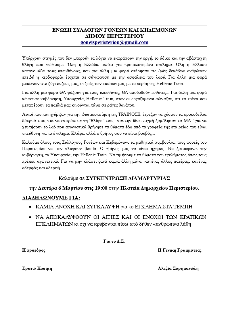 «Η καρδιά και η σκέψη μας είναι μ’ αυτούς τους γονείς που έχασαν το βράδυ της Τρίτης τα παιδιά τους στην κοιλάδα των Τεμπών, με αυτούς που κλαίνε τους φίλους, τους συμμαθητές, τους συζύγους, τους πατεράδες και τις μανάδες τους. Και έχουμε οργή, μαζί και θλίψη. Έχουμε κι εμείς οργή όπως κι οι χιλιάδες μαθητές, φοιτητές και εργαζόμενοι που ξεχύθηκαν στους δρόμους κάθε πόλης της χώρας, γιατί αυτός ο χαμός ήταν πέρα για πέρα άδικος. Και το άδικο τους πνίγει τους ανθρώπους ,τους βγάζει στους δρόμους και με το κεφάλι ψηλά τους ωθεί να απαιτήσουν να αποδοθούν ευθύνες σε όλους όσους προκάλεσαν και προκαλούν εγκλήματα», σημείωσε στην ομιλία της η Έρη Κασίμη, πρόεδρος της Ένωσης Συλλόγων Γονέων και Κηδεμόνων Περιστερίου.