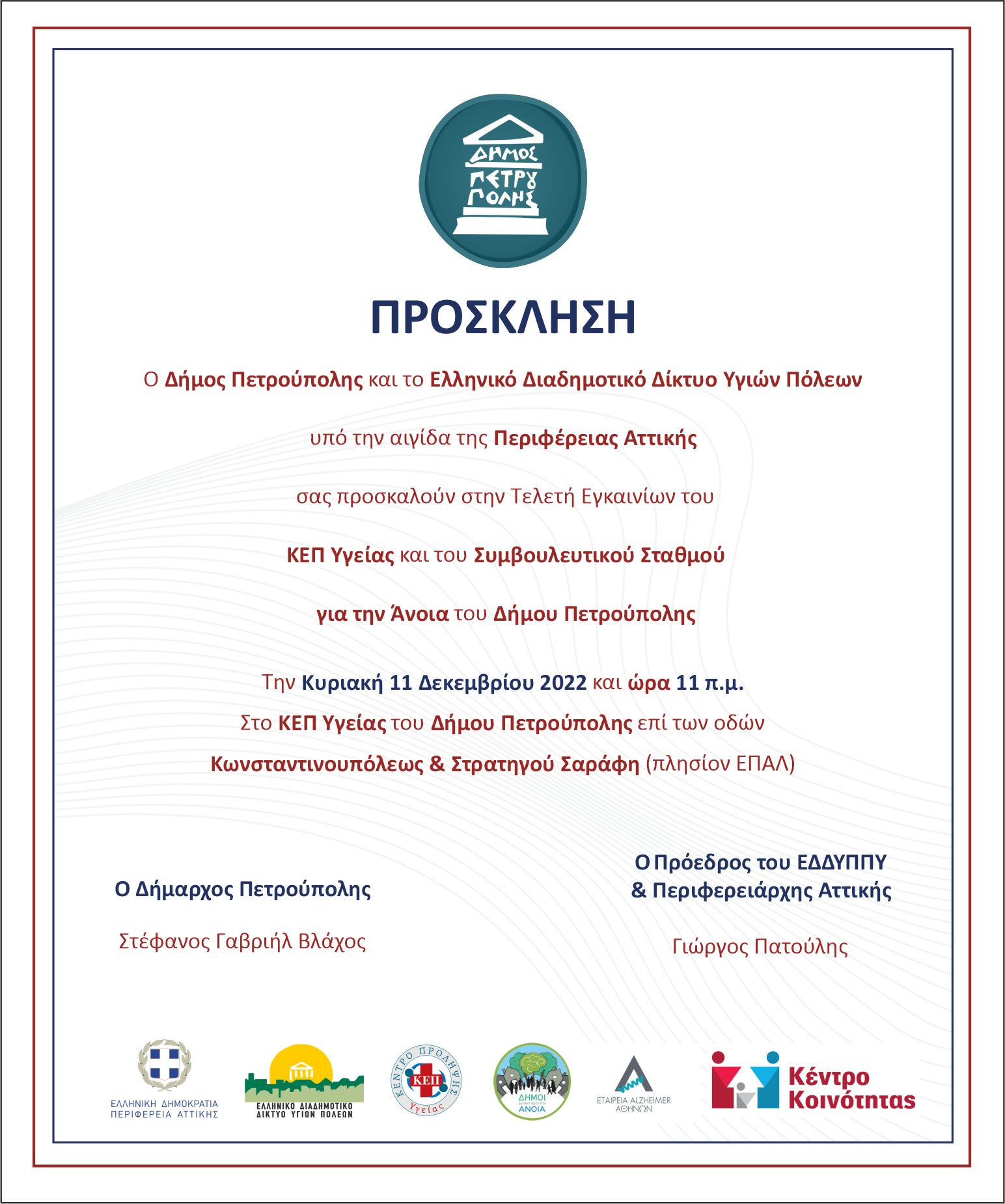 Διαβάστε την πρόσκληση για τα εγκαίνια του ΚΕΠ Υγείας και του Συμβουλευτικού Σταθμού για την Άνοια του Δήμου Πετρούπολης, στις 11-12-2022 και ώρα 11 π.μ.
