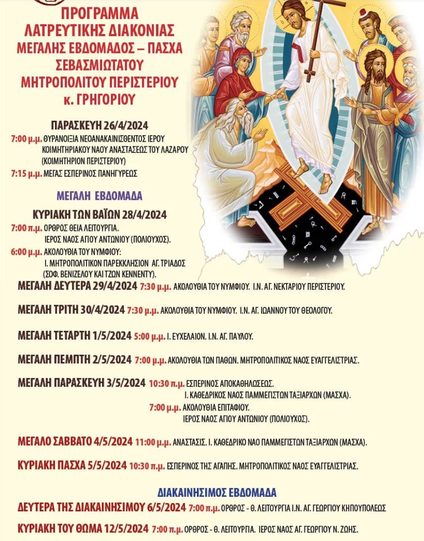 Το Μεγάλο Σάββατο στη λειτουργία της Ανάστασης ο Μητροπολίτης Περιστερίου θα τελέσει τη λειτουργία στον Ιερό Καθεδρικό Ναό Παμμεγίστων Ταξιαρχών (Μάσχα). Για την ακολουθία του Επιταφίου την Μεγάλη Παρασκευή θα τελέσει τη λειτουργία στον Ιερό Ναό Αγίου Αντωνίου.