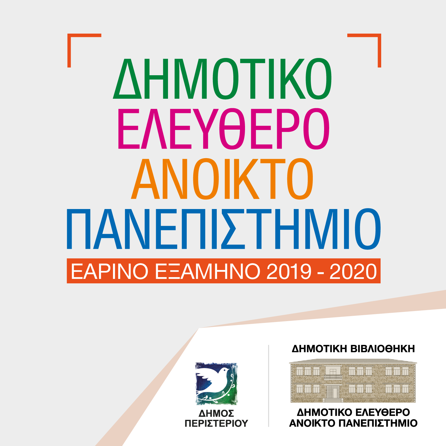 Το Δημοτικό Ελεύθερο Ανοικτό Πανεπιστήμιο Περιστερίου ενημερώνει ότι το πρόγραμμα των διαλέξεων του Εαρινού Εξαμήνου ξεκινά από τον Φεβρουάριο 2019 και ολοκληρώνεται τον Μάιο του 2020, οι οποίες πραγματοποιούνται στο κτίριο της Δημοτικής Βιβλιοθήκης (Αδριανουπόλεως και Σκρα).