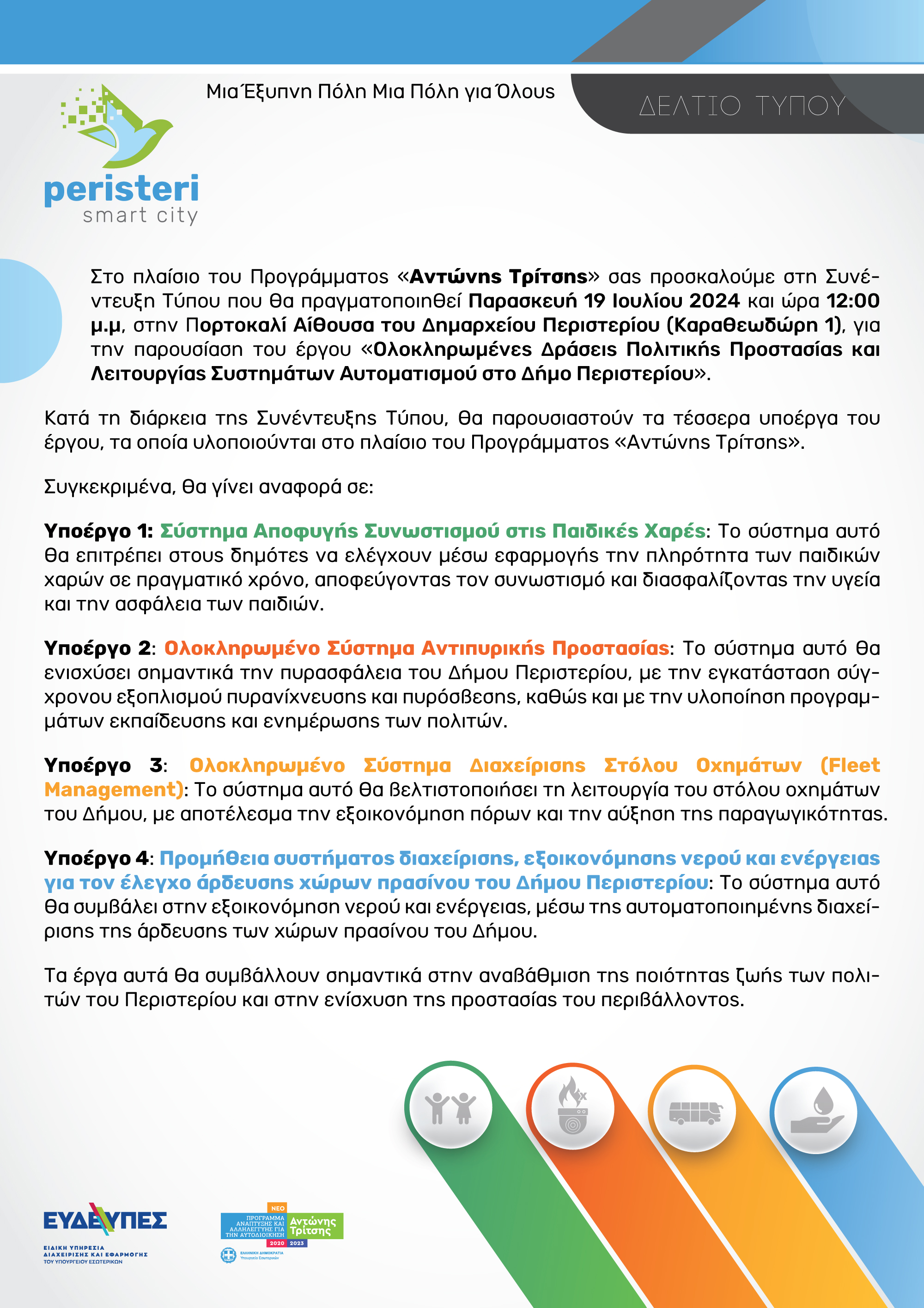 Πρόσκληση για Συνέντευξη Τύπου με θέμα «Ολοκληρωμένες δράσεις πολιτικής προστασίας και λειτουργίας συστημάτων αυτοματισμού στο Δήμο Περιστερίου»
