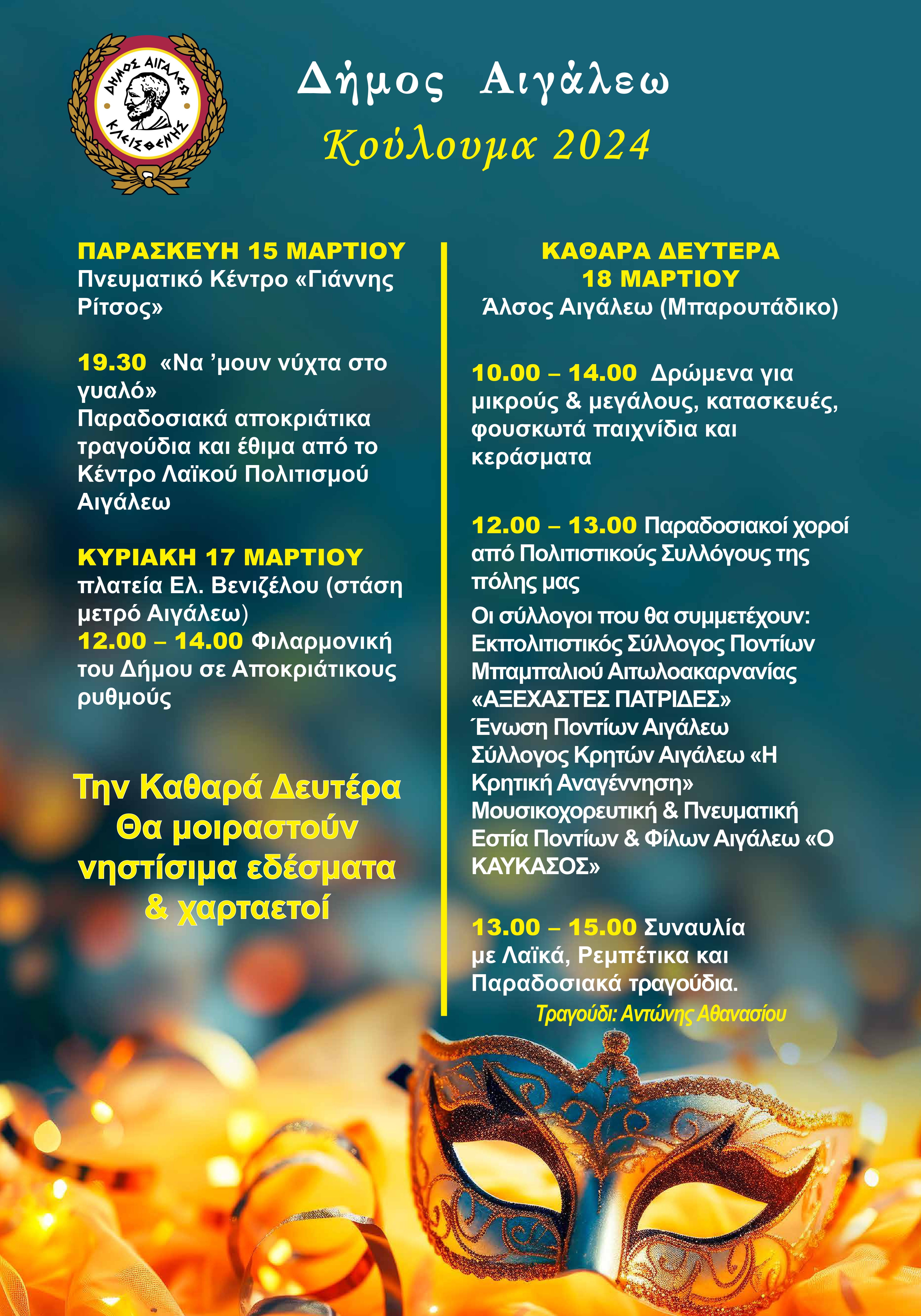 Αποκριάτικα έθιμα, ήχοι της Φιλαρμονικής, χοροί από Πολιτιστικούς Συλλόγους, δρώμενα για παιδιά, χαρταετοί και νηστίσιμα εδέσματα με ρεμπέτικα και λαϊκά ακούσματα, είναι κάποιες από τις εκδηλώσεις που έχουν προετοιμαστεί με ιδιαίτερο κέφι και μεράκι από τον Δήμο Αιγάλεω