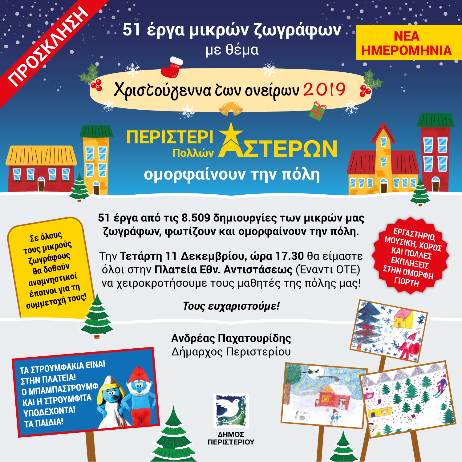 Με αφορμή τις γιορτινές ημέρες, ο Δήμος Περιστερίου προσκάλεσε για μια ακόμη χρονιά, όλα τα παιδιά της πόλης να ζωγραφίσουν με θέμα: "ΧΡΙΣΤΟΥΓΕΝΝΑ ΤΩΝ ΟΝΕΙΡΩΝ 2019" και τους έδωσε την ευκαιρία να φιλοτεχνήσουν. Ρεκόρ συμμετοχής 8.509 μικροί ζωγράφοι!!!