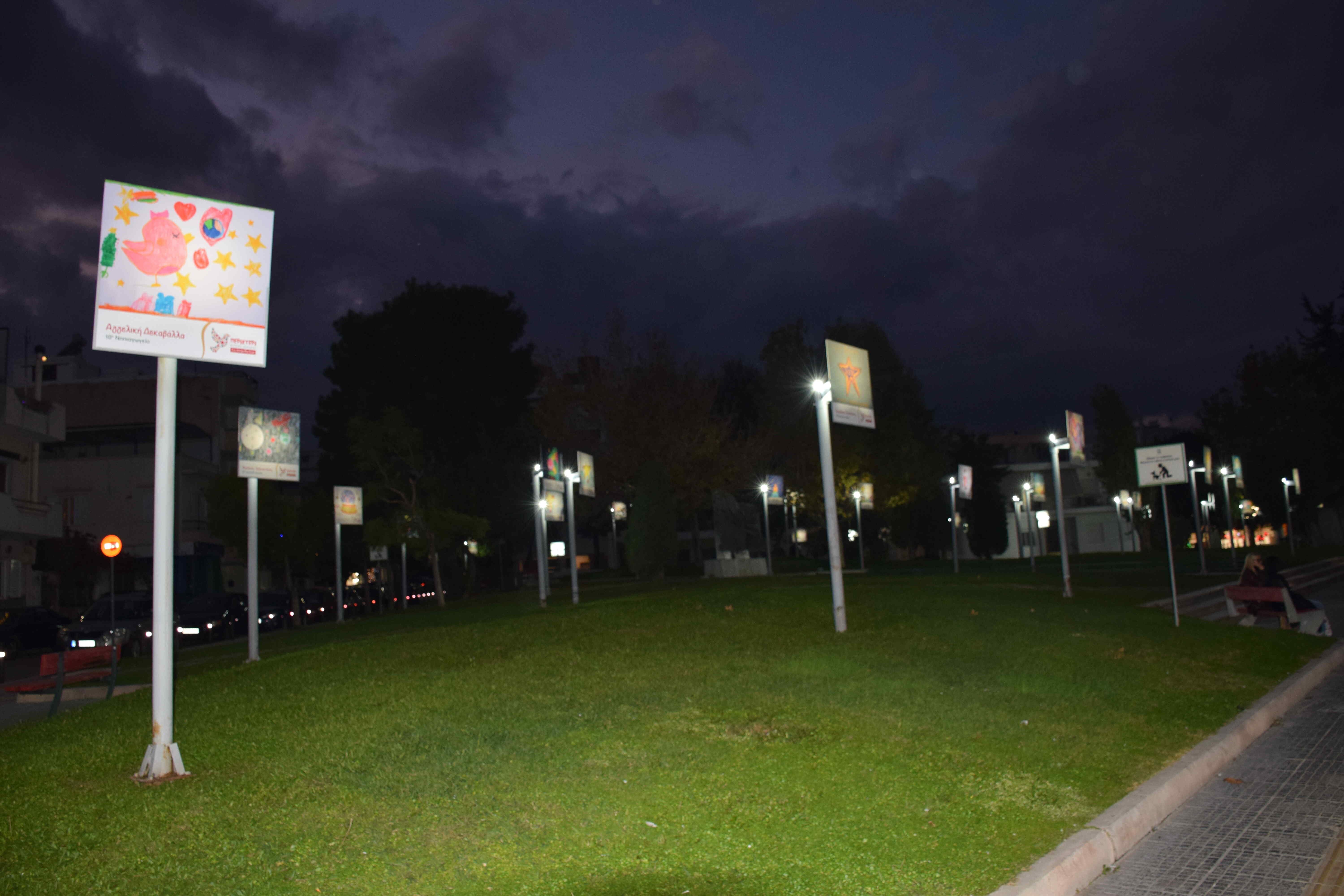 Η Επιτροπή Εικαστικών των Εργαστηρίων Ζωγραφικής της κοινωφελούς Δημοτικής Επιχείρησης Πολιτιστικής Ανάπτυξης Δήμου Περιστερίου (Δ.Ε.Π.Α.Δ.Π.) επέλεξε 50 έργα μικρών ζωγράφων, τα οποία κοσμούν την πλατεία και, με τις αυθεντικές πινελιές της παιδικής ψυχής, αναδεικνύουν τον δημόσιο χώρο σε σημείο πολιτισμού, χαράς και δημιουργικής έκφρασης.